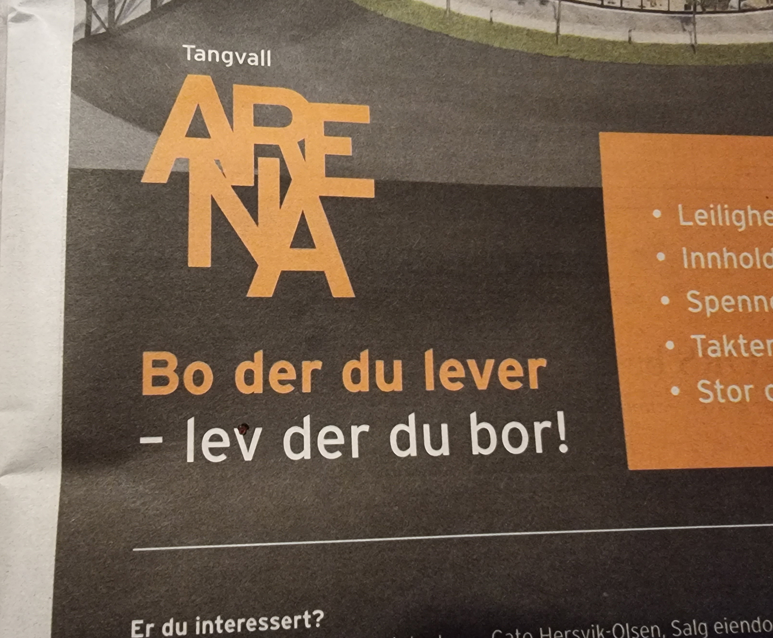 Det er nok en yrkesskade. Kommet til over tid. Men den kan jeg leve med. Jeg har jo ingen planer om verken å møte meg selv i veggen eller at noen liten frue kan velte mitt store lass. Ei heller skal jeg vanne bekken mens jeg går og så vet jeg jo at gresset er alltid på den andre siden. Vel, jeg er av sorten som får bilder i hodet. Og kanskje andre bilder enn hva som var tiltenkt av den som ytrer en tekst eller fotografi eller noget annet. Slik var det i dag da jeg så en annonse for et nybygg på Tangvall. Og ikke et ondt ord om Tangvall. Det er et fint sted, hovedstaden i Søgne og porten til Høllen. Tangvall er snart for en liten by å regne. Det som satte tankene i sving, eller muligens fikk dem til å stoppe var slagordet; Bo der du lever – lev der du bor . . . . .