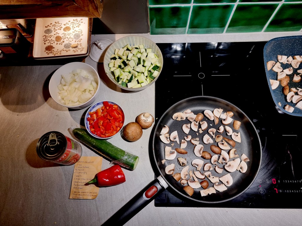 Og synes du grønt er skjønt så kjør på og kutt og stek og kok og fres. Oppskriften under er for to posjoner. Kjør på med mer squash, sopp og løk for å øke mengden. Kikerter og sorte bønner kan og legges oppi. Nammenam.