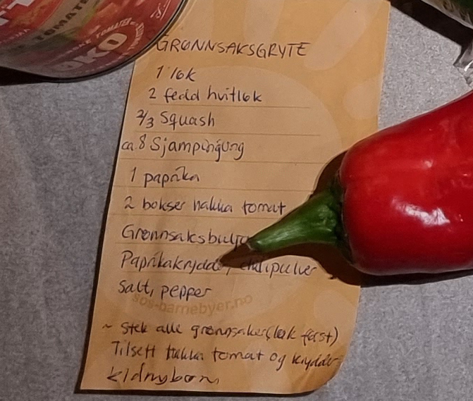 Denne deilige grønnsaksgryta gjør det lett å gå grønt. Vår generasjons inngrodde tanke om at kjøtt er tøft får seg en på tryne av Odas Grønnsaksgryte. Og Oda velger ofte grønt. Hun besøker sine gamle sørlandske slektninger av og til og en gang disket hun opp med denne gryta. Siden har den blitt fast på menyen vår. Den er så enkel å tilberede at en tocella kar som meg kan utføre jobben. Her brukes gode ferske råvarer og litt krydder med sting. Ønsker du ennå litt mer rikholdig smak så velg økologiske grønnsaker. De smaker ofte litt kraftigere enn sine vaksinerte søsken. Dog er de mye dyrere så det får være opp til budsjettet. Uansett ingen kostbare ingredienser. Og vannet begynner akkurat nå å samle seg i munnen bare jeg tenker på den. Det er et godt tegn.