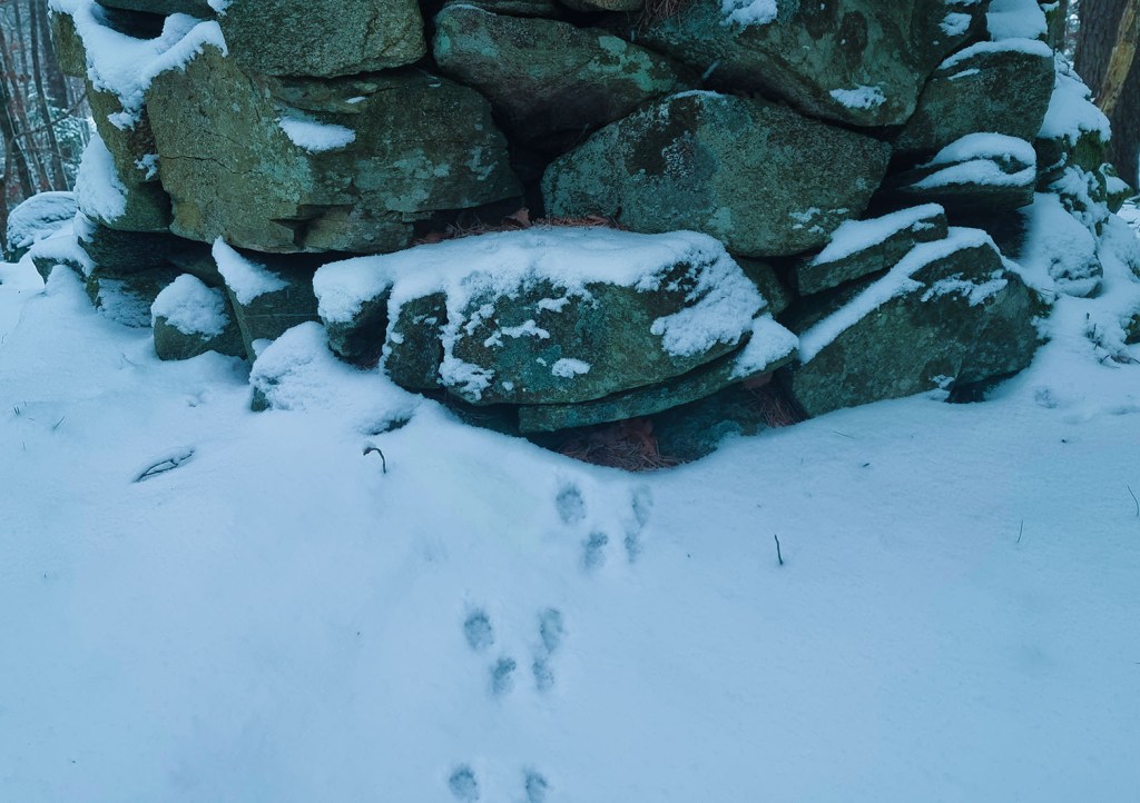 Det snølaget viste frem ekornspor i skogbunnen. Jeg fulgte dem oppover mot toppen av heia. Til øverst oppe på den lite besøkte Strømsheia ved Rona. Oppover mot den flotte varden som står der. Og naturen er fin og overraskende. Ekorn er smarte små dyr. Dette lille ekornet har funnet sin borg. En uinntakelig festning for plagsomme kråker og skjærer og nattens hylende spurvehauker. Sporene hoppet så fint opp på en stein og forsvant inn i et hull. Fra nå av varden Fort Ekorn for meg. Lurer på om den driver med E-sport der inne?