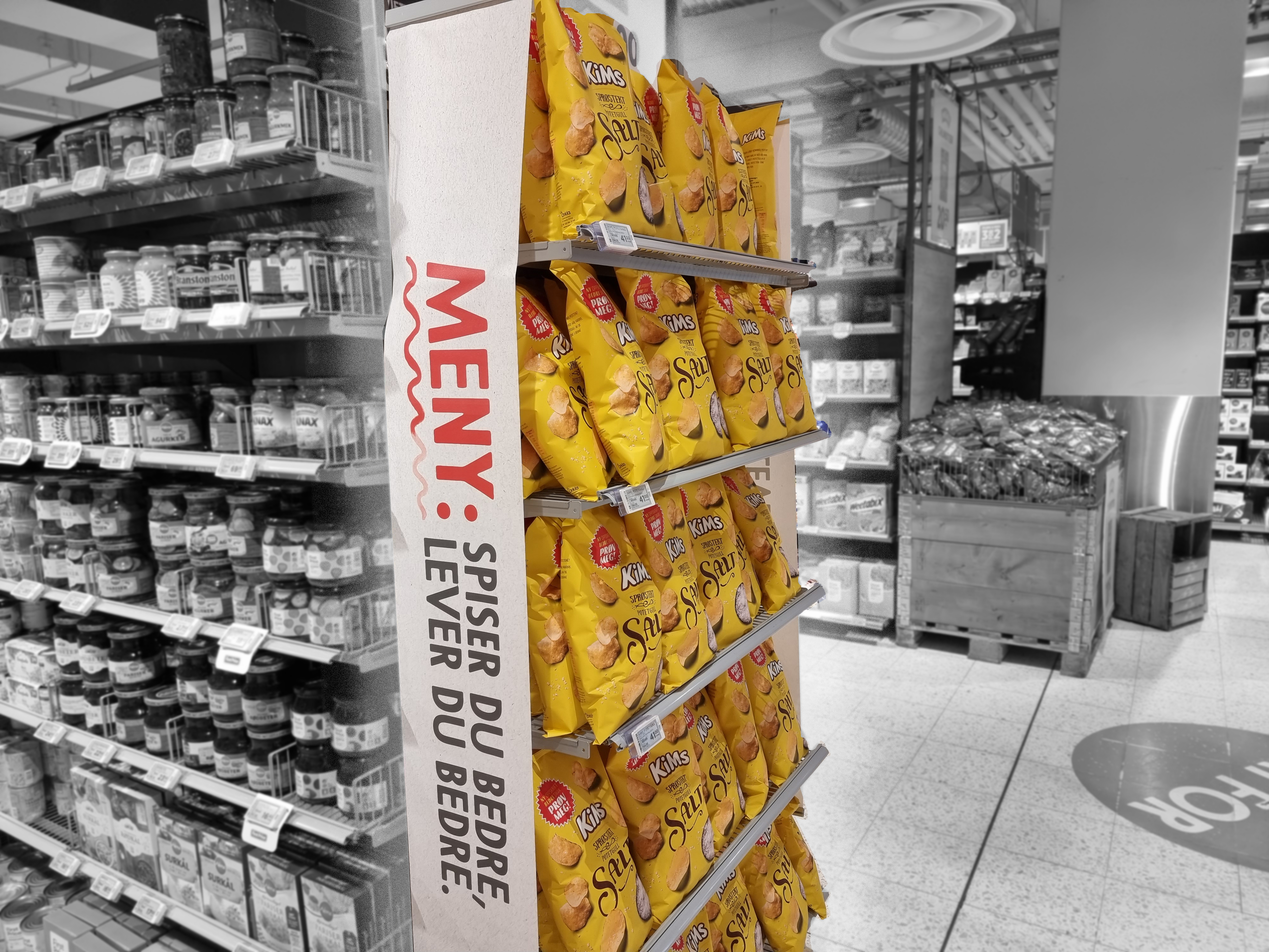 En tanketom Tomm tuslet tett inntil hylla på Meny i byen. SPISER DU BEDRE LEVER DU BEDRE lyste det mot meg plutselig. Det er meny sitt fyndige slagord. Det er nok riktig det. For jeg merker på vomma mi de gangene jeg lar meg friste av mat som ikke regnes som “bedre”. Chips er en av mine dårlige svakheter. Det er med god selvinnsikt og svært liten motstandskraft at slike poser havner i bippemaskinen før jeg forlater butikken. De har nok sett det på meg. De hyggelige folkene som jobber der. De har nok sett livvidden øke i takt med chipsposene i kurven. Og høflige som de er, sier de det ikke direkte til meg. I stedet for henger de opp en stor oppfordringsplakat på potetgullhylla. En klar personlig advarsel på lokkehylla.