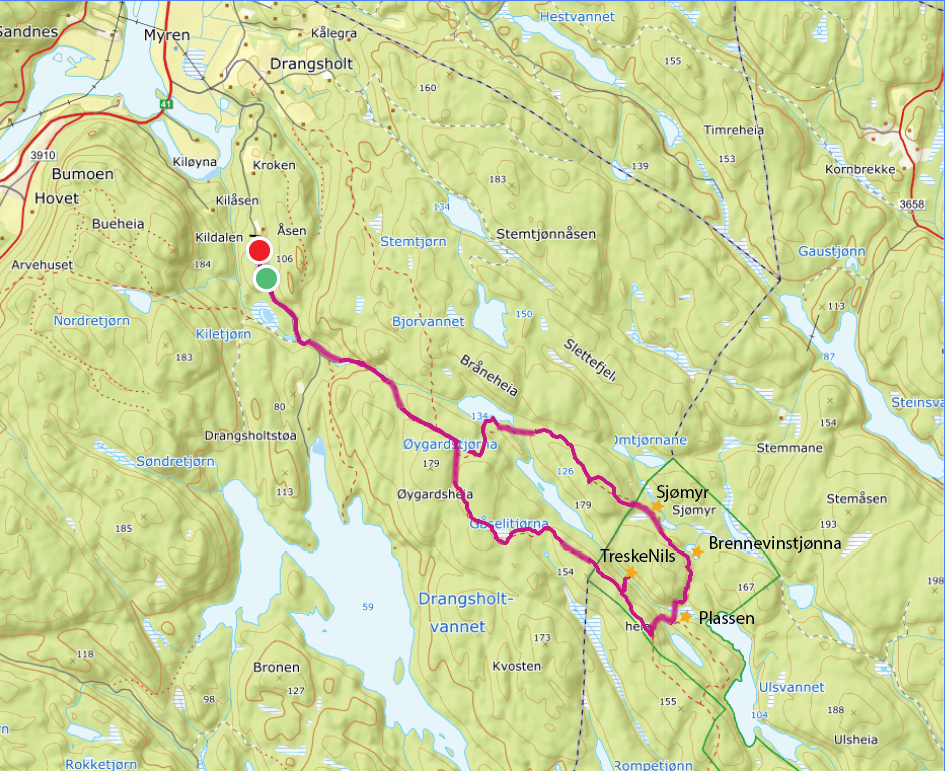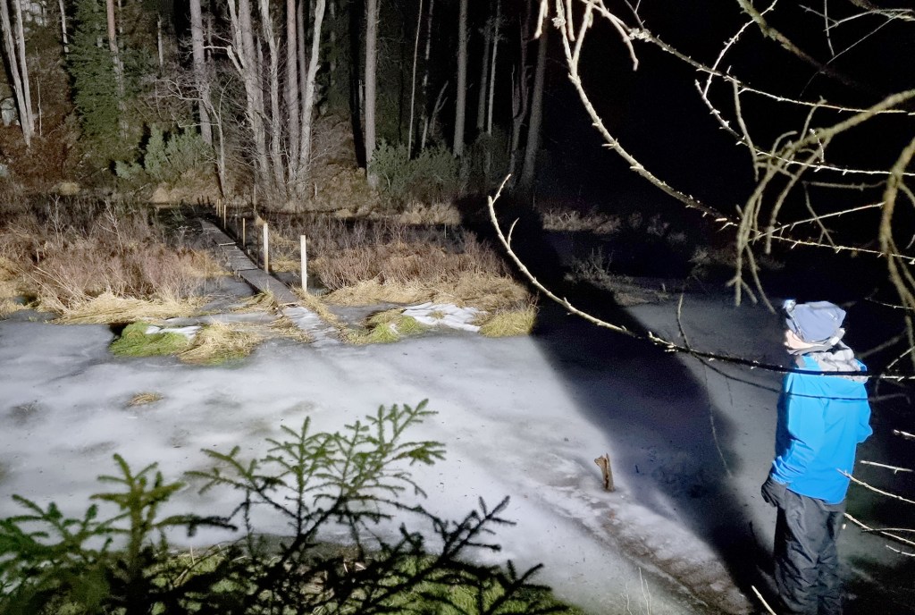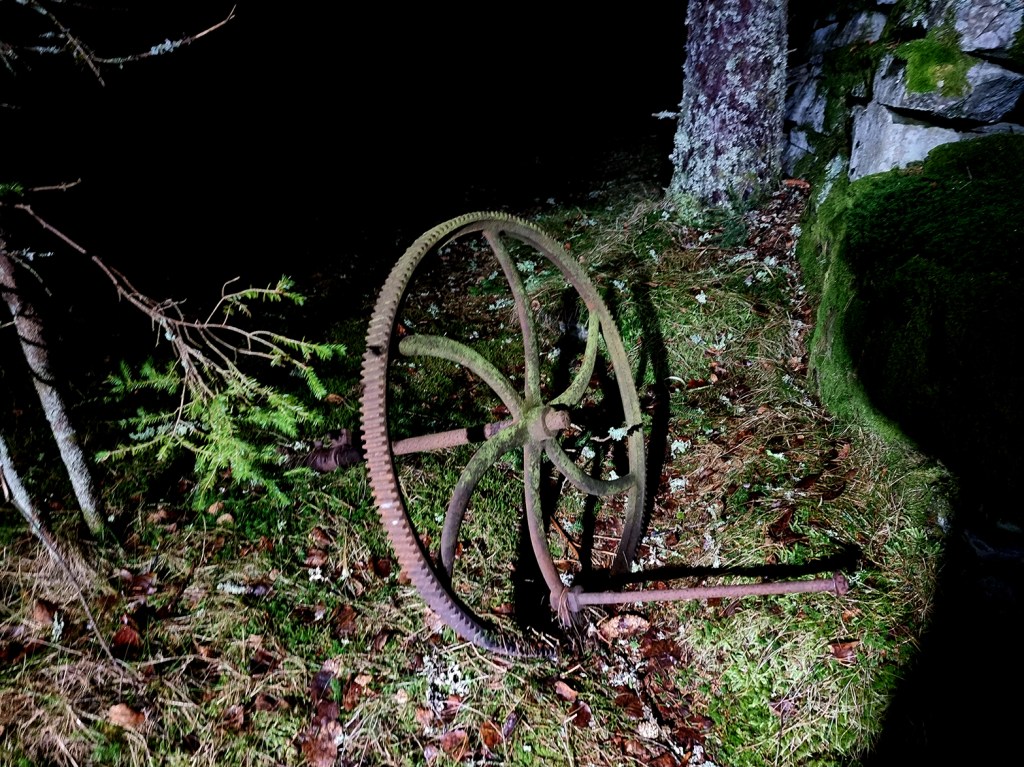 Stien ledet oss over Sjøhei med sin utsikt som i stummende mørke er som alle andre utsikter; mørk. Videre fant vi et lite og fraflyttet bruk langt inne i skogen. Tveit Turlag har som vanlig gjort en strålende jobb med merking av løype og info-skilt på ulike steder. Sjømyr hette plassen og vitnet om slit. Det var her de virkelige farmen-deltakerne levde. Et hardt og tøft liv. Men kanskje godt også. I 1910 flytta ei gammel enke inn, 60 år gamle Karen Ånonsen Gåseland. I følge rykter var hun grov i målet. Men snill var hun. Hun huset mange på dette lille bruket. Blant andre Treske-Nils, den litt lutrygga knallsterke fyren med talefeil. Han som på tragisk vis døde for tidlig. Men det var ikke å se på forfalne hus vi var kommet. Vi fortsatte mot det forjettede vann.