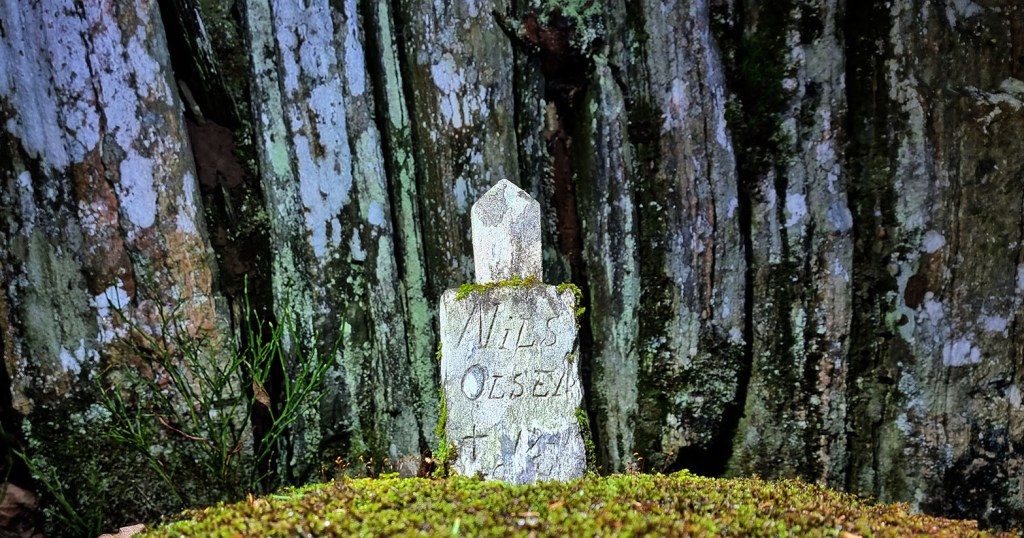 TreskeNils har sin egen bauta. Bitte liten men inntrykksfull allikevel. Et minnesmerke der han en gang frøs i hjel. I jula 1933 døde han her. Noen trodde han var borte og andre trodde han var hjemme. Så ingen gikk ut for å lete. Han frøs i hjel bare 300 meter hjemmefra. En trist historie. Steinen var lett å overse, men når vi først fikk øye på den var den stor i all sin lille prakt.