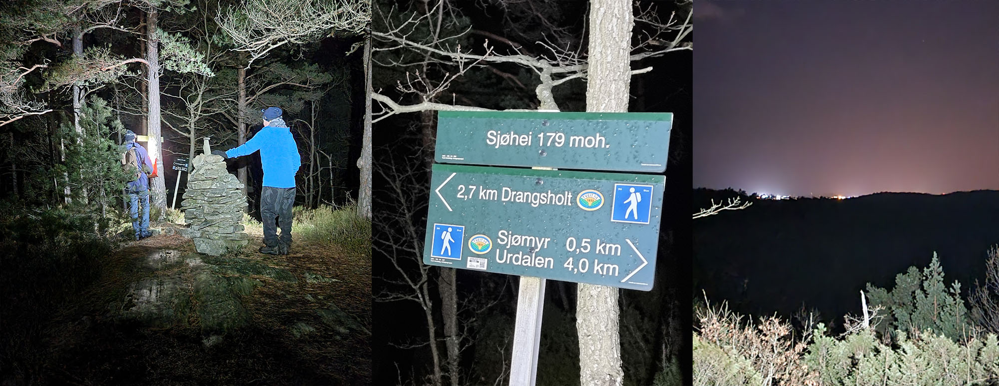 Stien ledet oss over Sjøhei med sin utsikt som i stummende mørke er som alle andre utsikter; mørk. Videre fant vi et lite og fraflyttet bruk langt inne i skogen. Tveit Turlag har som vanlig gjort en strålende jobb med merking av løype og info-skilt på ulike steder. Sjømyr hette plassen og vitnet om slit. Det var her de virkelige farmen-deltakerne levde. Et hardt og tøft liv. Men kanskje godt også. I 1910 flytta ei gammel enke inn, 60 år gamle Karen Ånonsen Gåseland. I følge rykter var hun grov i målet. Men snill var hun. Hun huset mange på dette lille bruket. Blant andre Treske-Nils, den litt lutrygga knallsterke fyren med talefeil. Han som på tragisk vis døde for tidlig. Men det var ikke å se på forfalne hus vi var kommet. Vi fortsatte mot det forjettede vann.