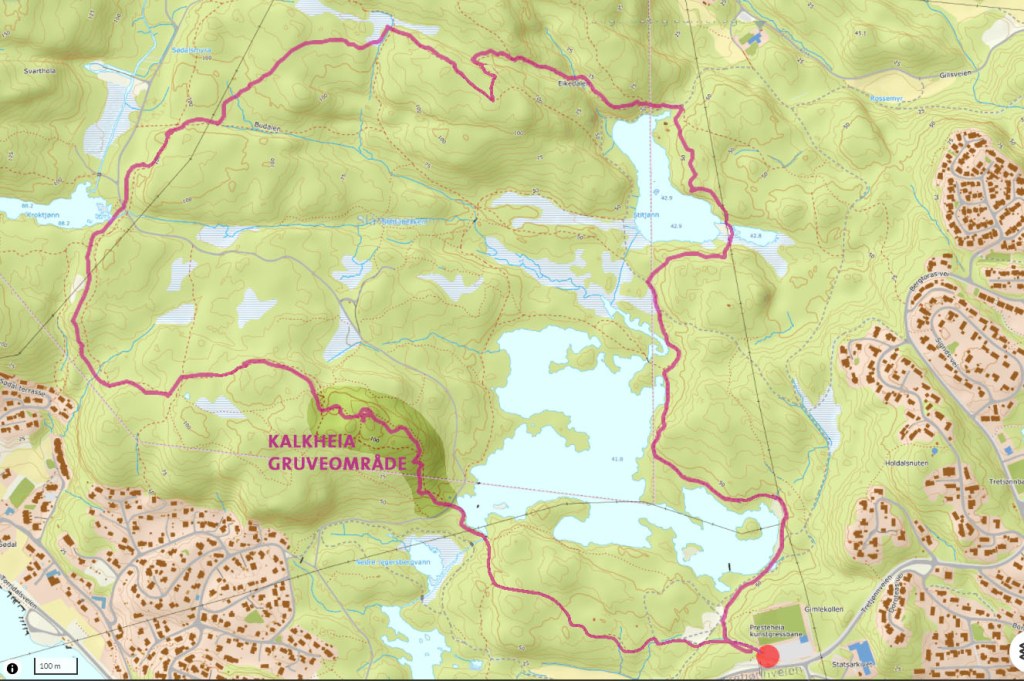 Kakling om kalk. Ikke motløs men kunnskapsløs. Stillheten senker seg på vei opp til Kalkheia. Fra demningen på ved Øvre Jegersbergvannet starter stigningen opp. Ganske bratt opp. Nok til å bli god og varm i toppen. Og med postcorona lungekapasitet stilnet i alle fall jeg helt i det vi nærmet oss toppen. Igjen var vi seks lavterskelmenn på tur. Hodelykta var med men med turstart kl. 18 hadde vi over en time med dempet belysning fra himmelen igjen. På Kalkheia svikta lokalkunnskapen. Ingen kunne historien om gruvene. Har vært her sikkert 100 ganger uten å vite. I etterpåvitenbegjærlighetens navn leste jeg meg opp når jeg kom hjem:
