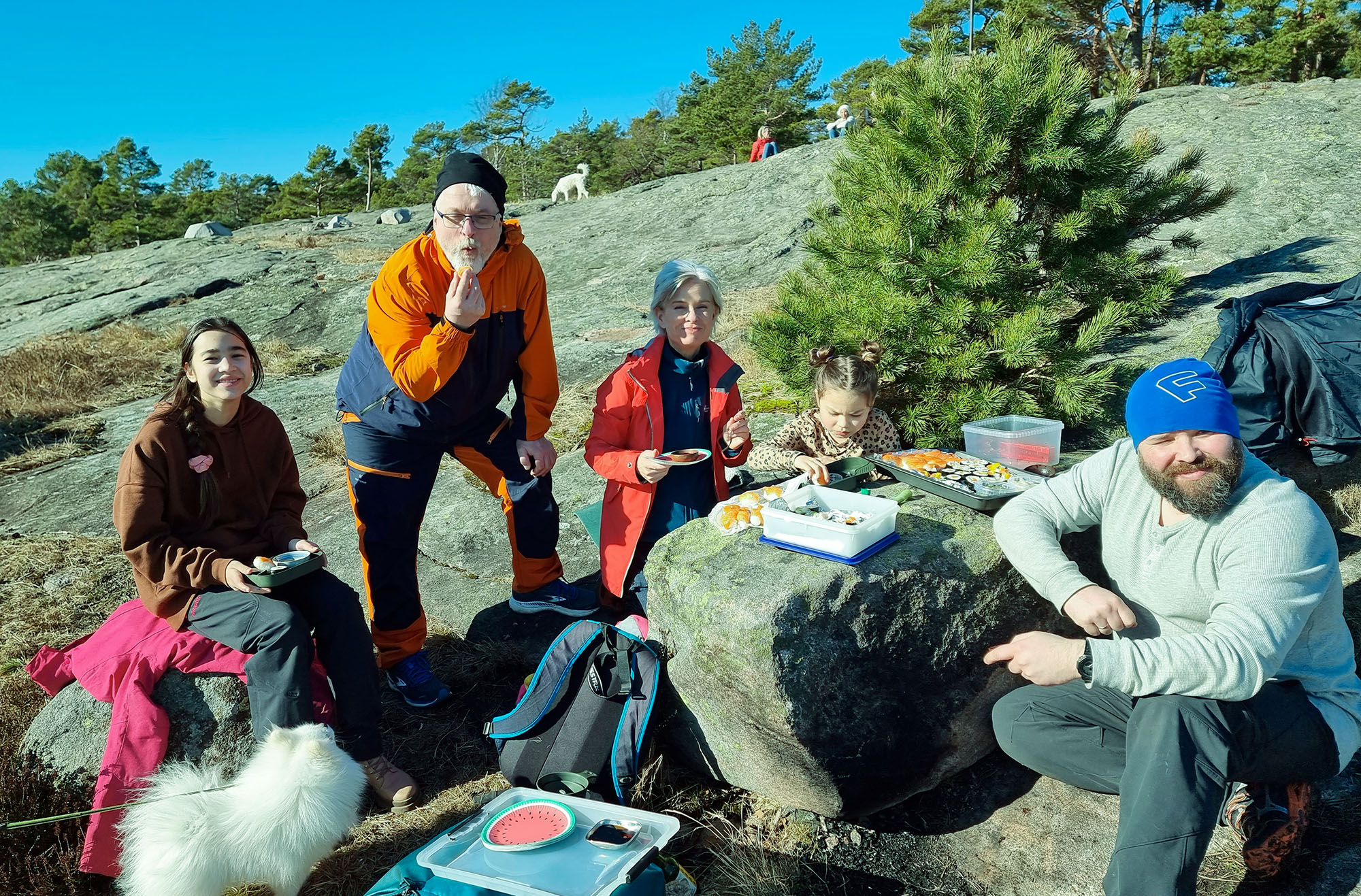 Vi satt oss ned mellom kleine pølsebål og skrinne matpakker. Og der dekket vi ut et stort sushibord med ingefær og tang og teryaki og soya.