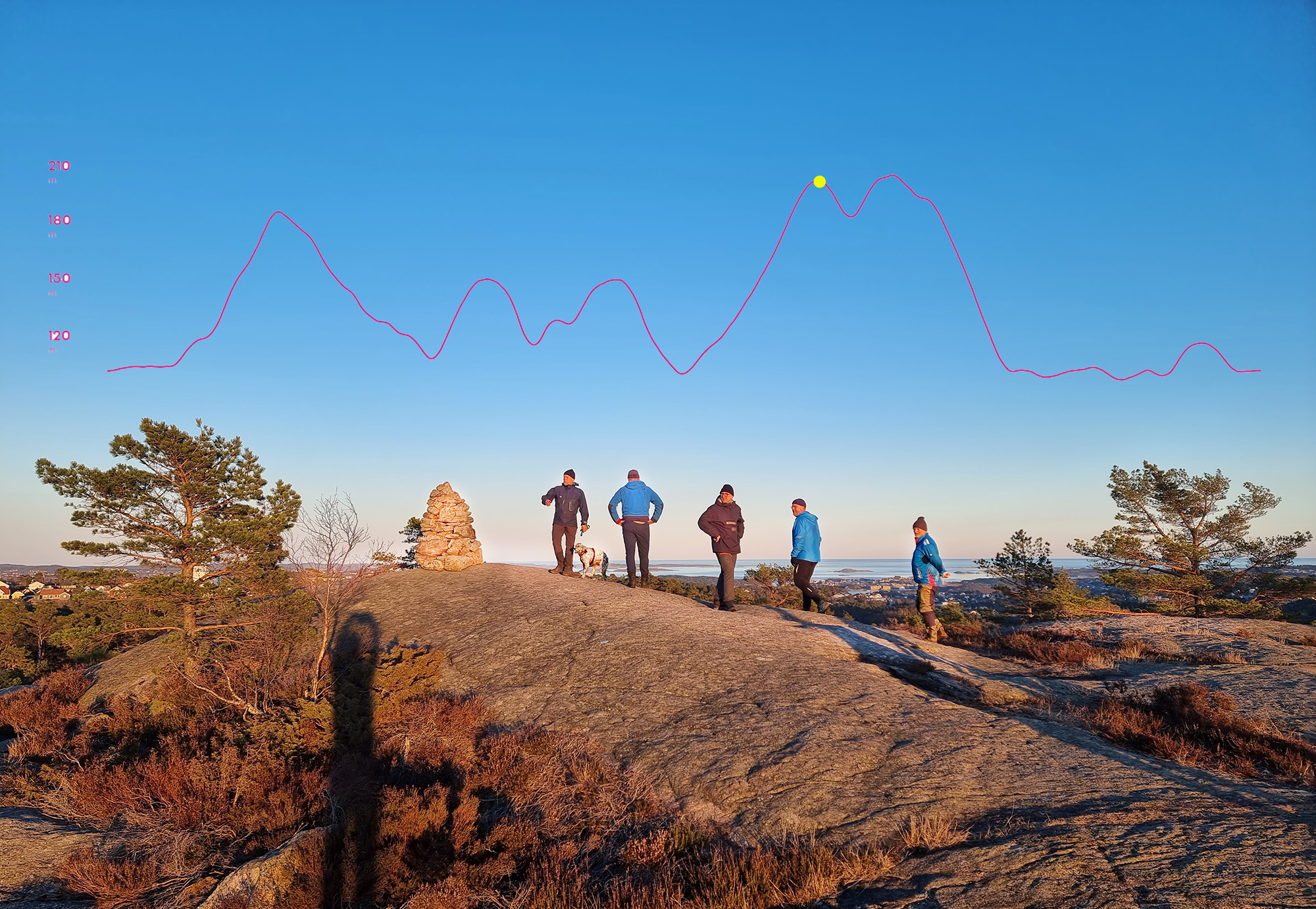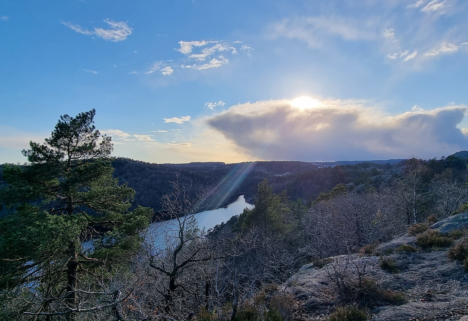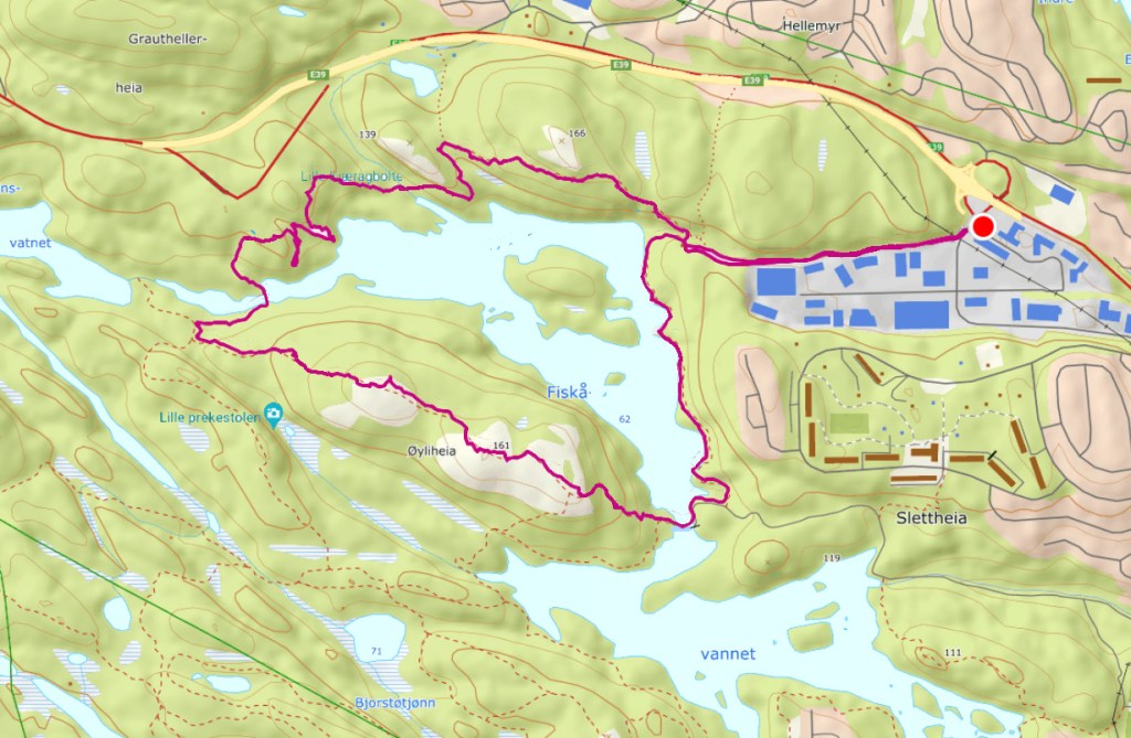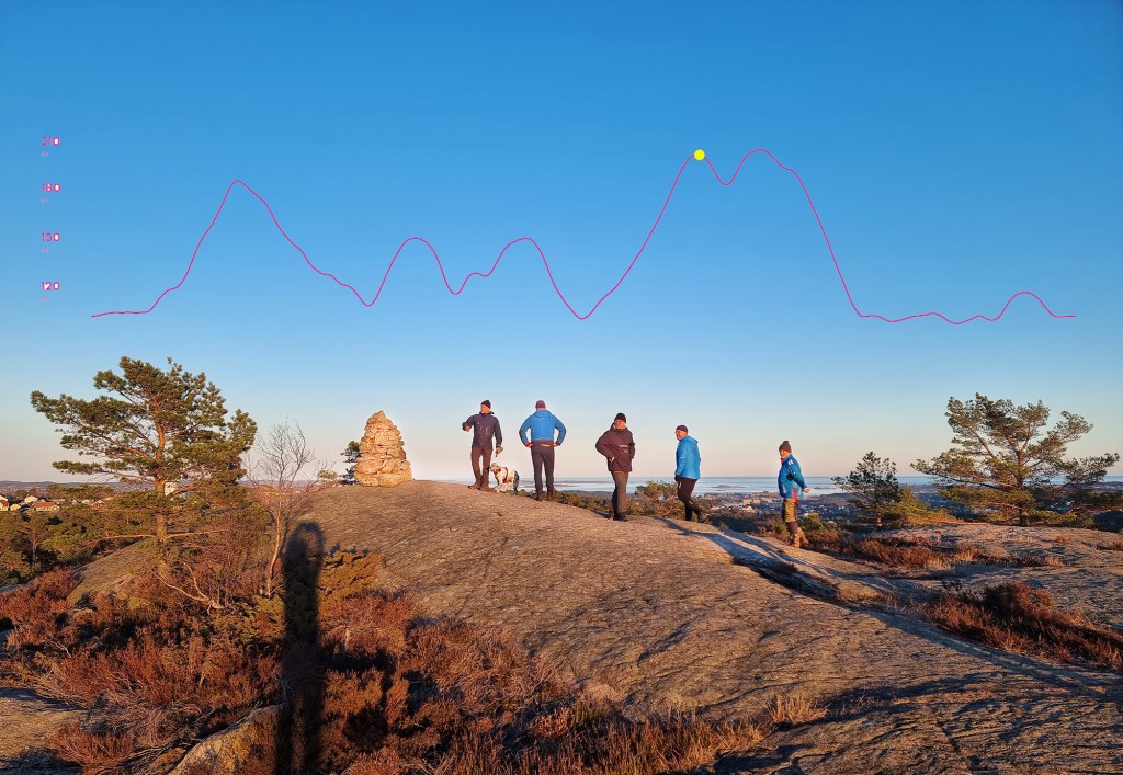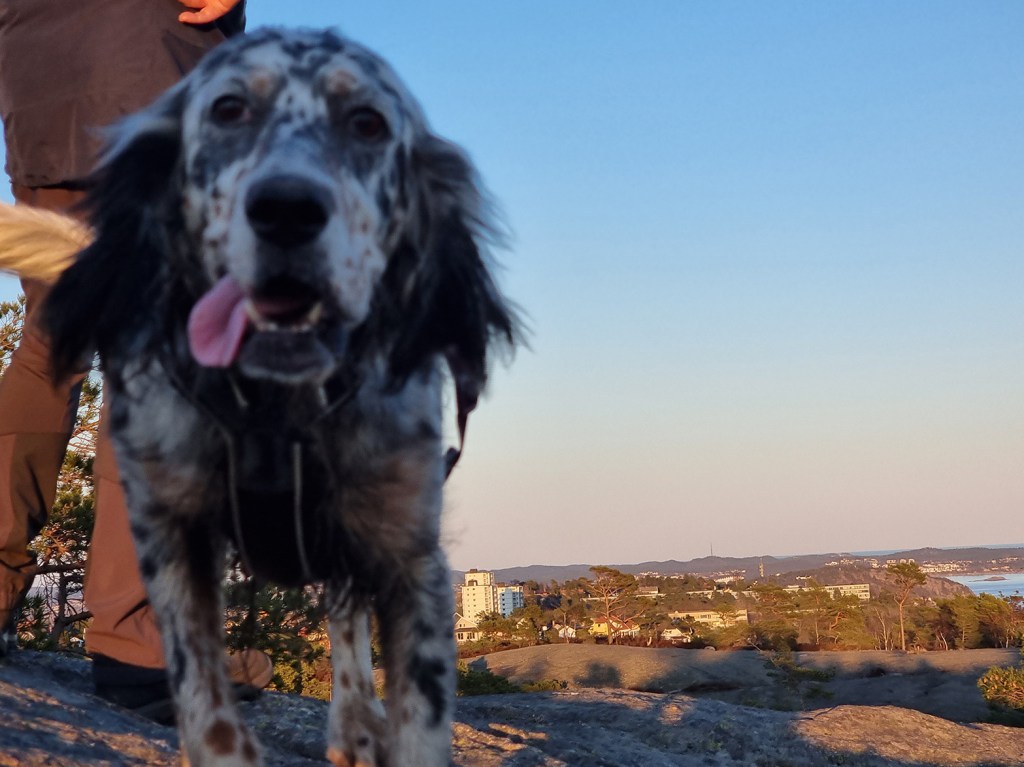 I dag skulle vi gå rundt Fiskåvannet hadde turoverguiden bestemt. Vi gikk rundt Hamrevann forrige gang. En fin flat tur så jeg så frem til en fin stille ettermiddagstur rundt Fiskåvannet. Vi parkerte ved vår alles beste venn og verste fiende, Biltilsynet. Turen startet behagelig inn over en grussvei. Praten gikk lett og jeg så frem til en finfin tur. Et stykke inn langs veien stod et skilt med innskriften Borlihei. Jeg ante fare. Og den ble bekreftet da guiden pekte opp og inn på den bratte sti. Igjen stilnet samtalene på vei opp. Det var tungt og bratt. Vi kom oss endelig opp. Men det var bare så vidt vi var der oppe før vi skulle helt ned igjen slik at vi kunne gå halvveis opp igjen der hvor stien plutselig vendte nesa nedover. Mine to bein ble slitne og knærne til denne geriatriske gjengen knirket og knaket. Det hjalp ikke at vi hadde med en fuglehund med firebeinsdrift som lekent og lett løp over alt. Vel nede fra Borlihei begynte det jaggu meg en lang oppoverbakke igjen. Gudd. Det fine var at det var stille og klart og de få gangene jeg klarte å løfte blikket var utsikten slående. Finest ble den oppe på Bølihei. Eller Øylihei som den egentlig heter. Ble til og med sliten i rettskrivninga på denne turen. Men der oppe var vi høyt på strå og myste sydover, der kunne vi nesten vinke helt til Hirtshals.