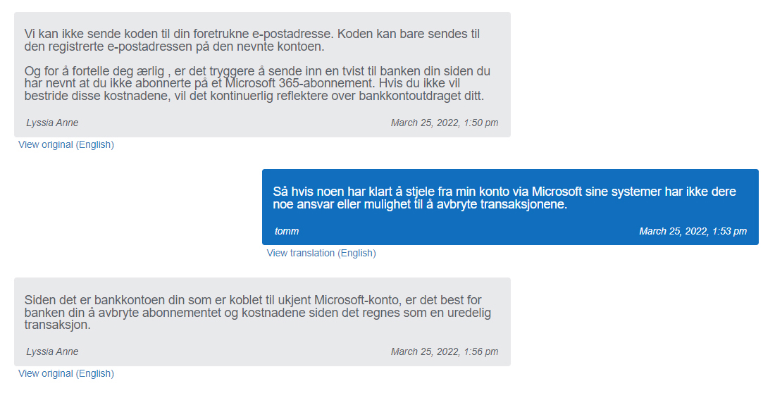 Jeg skiftet taktikk og prøvde meg på en support-chat. Her fikk jeg kontakt. Problemet ble forklart. Etter en time med forklaring og overføring av bilder og nummer og fakta fant vi ut noe. Microsoft sjekket og fant ut at det jeg sa stemte. Penger ble trukket fra min konto fra en annen bruker enn meg eller min kone. “Sperr den da!” sa jeg.
