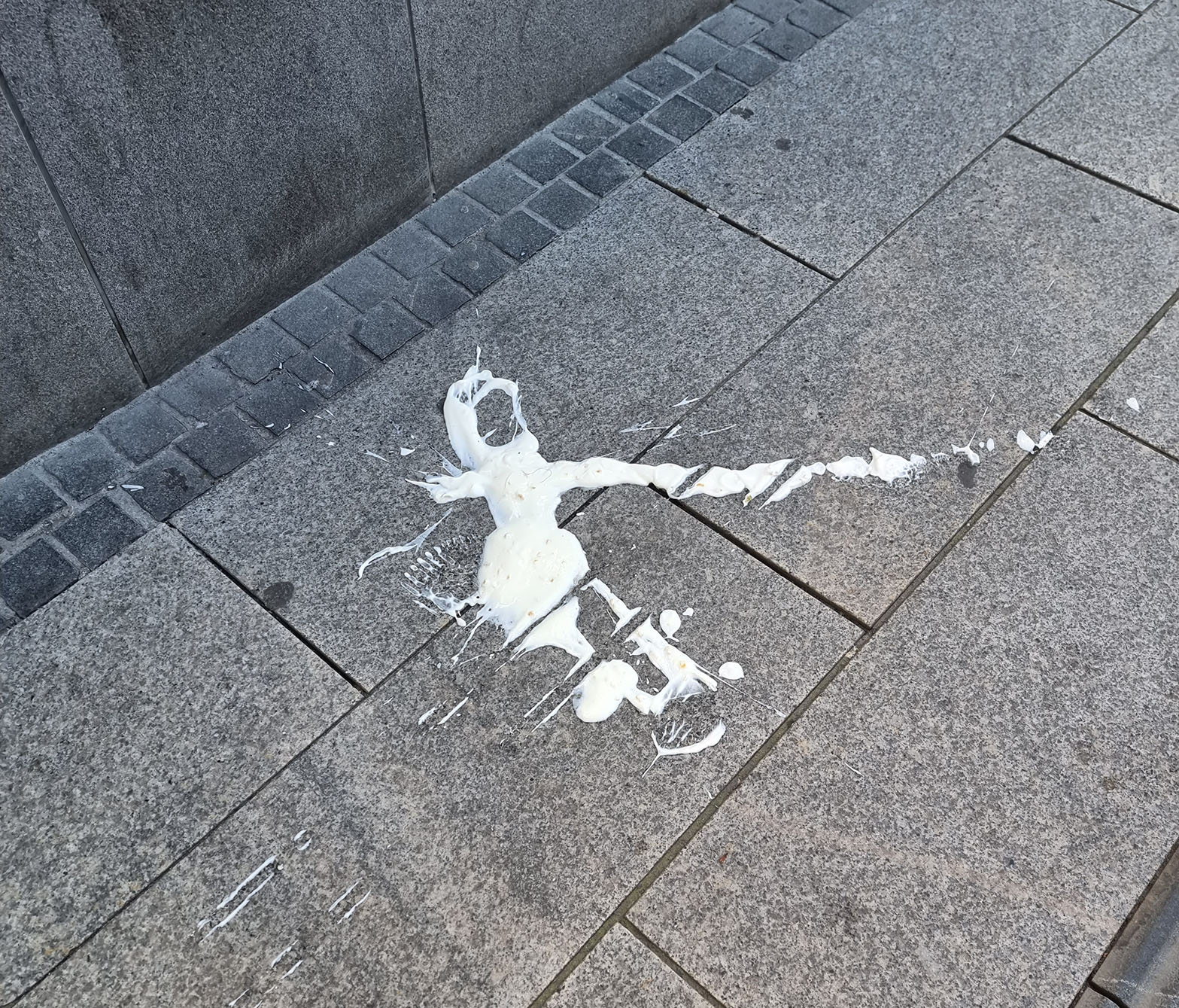 “Skulle likt å ha sett den måka”, tenkte jeg så opp i lufta. Men der var det jo ingen ting å se. Bare luft og litt flystreker. Men gudd. Jeg holdt på å trø rett inn i denne halvkilos måkeskiten. Heldigvis steget jeg over. Noen underlige blikk fikk jeg jo når jeg stoppet og tok bilde av denne etterlatenskapen mens jeg smilte. Noen vil sikkert påstå at det er en eller annen som har mistet en soft-is der på fortauet. Men jeg velger å tro noe annet.