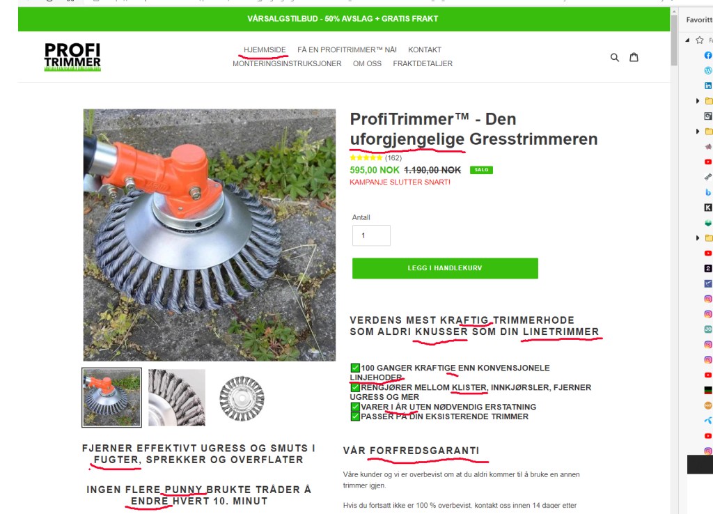 Noen tilbud er gode. Andre er bedre og enkelte er rett og slett for gode til å være sant. Det er kanskje ikke slik med dette tilbudet, men jeg aner ugler i mosen. Eller skjønt “mosen”? Med dette produktet fjerner du enkelt mosen, underlaget den satt på og et stykke ned i tellus. Det er voldsom kraft ser det ut til. En kantklipper som omgjøres til et demolitionmonster. Tilbudet gjelder bare i dag. Og i går og i forgårs og dagene før. De har muligens en kalender med trykkfeil i eller de er av sorten som synes alle dager er like. Allikevel. Produktet var såpass interessant at jeg klikket meg inn på siden.