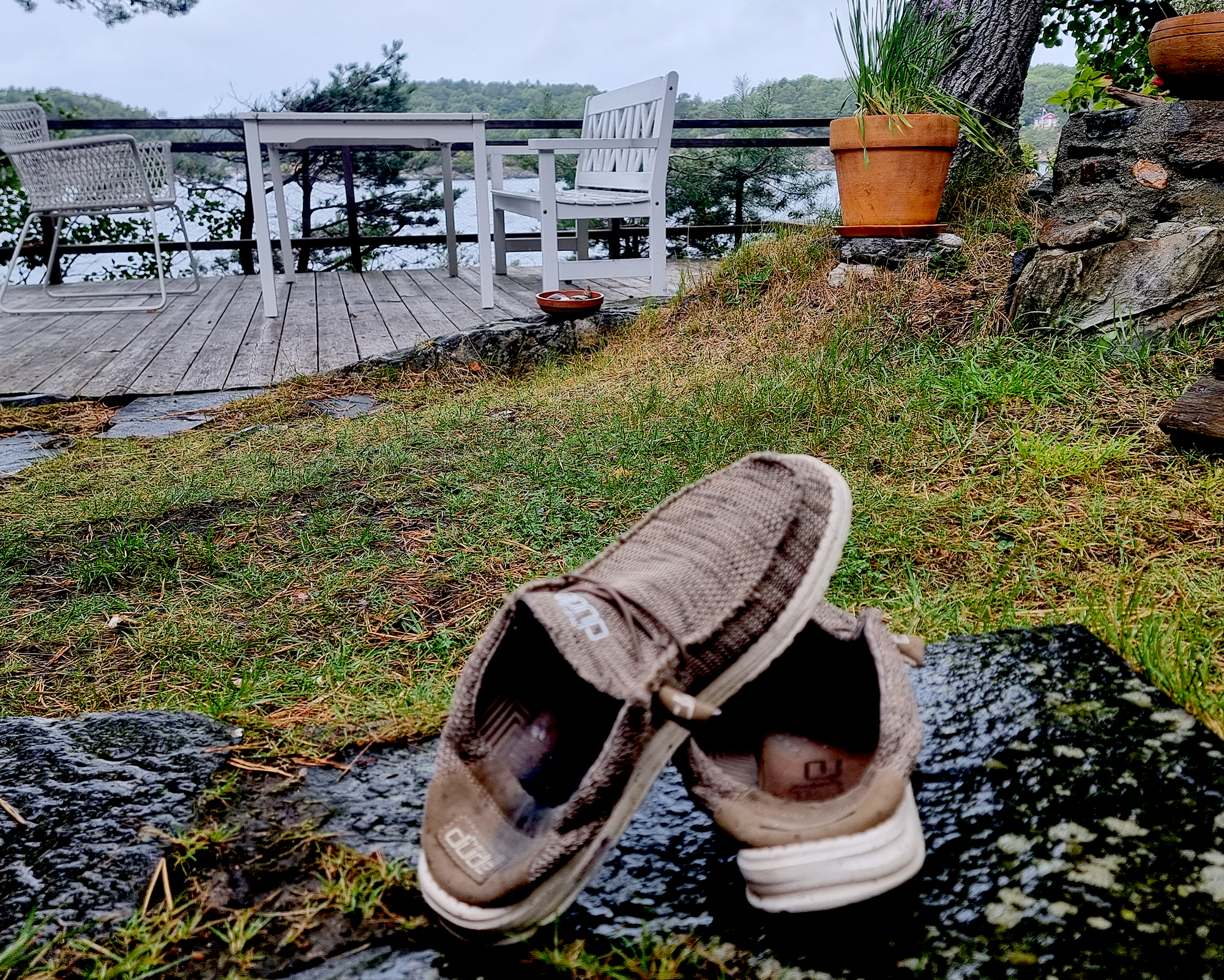 Snegle i skogen og snegle i skoen. To helt forskjellige opplevelser. Gudd. Følelsen av litt travelhet i kroppen. Rekker jeg bussen? Jeg haster og ser på klokka. Jeg bruker sånn ca 7 minutter opp til busstoppet om jeg går fort. Jeg har 8 minutter på meg i det jeg åpner hytte døra og smetter i skoen som har stått på utsiden over natta. Det er jo sommer og det er jo varmt. Jeg er sokkeløs i det tærne kjøres inn i skoåpningen.