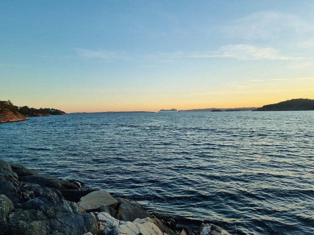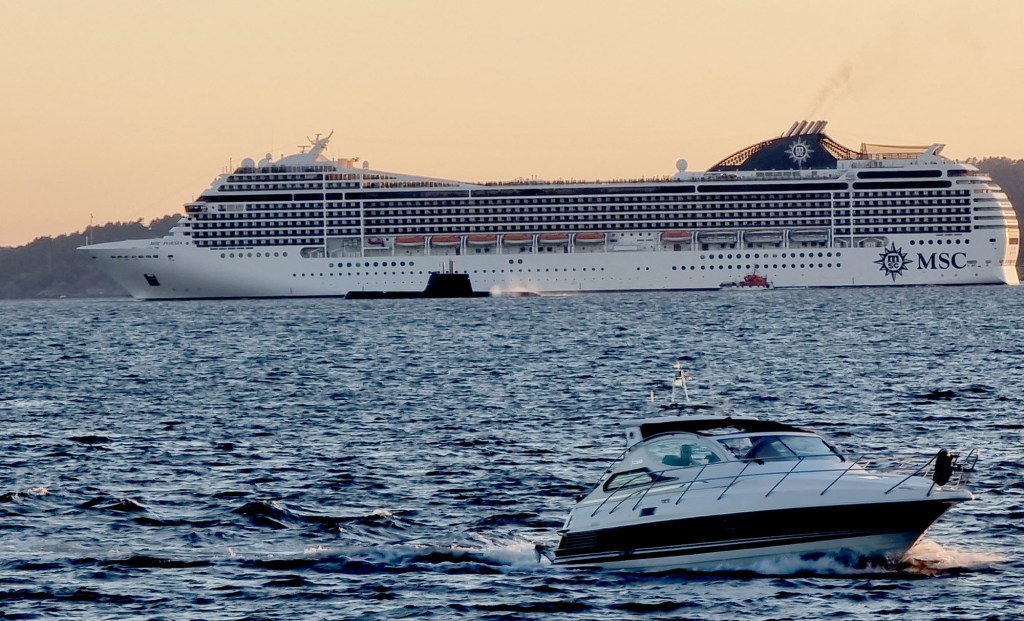 De liker å cruise rundt på havene de digre båtene. Men skal de inn og ut av vår vakre havn får de los. Kapteinen på dette Cruise Skipet må være av den overforsiktigbeskyttende arten. Ikke bare har han los med seg, men langs skutesiden følger en ubåt. Den skal sikkert ned og dobbeltsjekke dybder og lengder og se etter hvalrosspatruljer. –