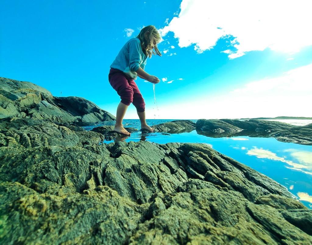 Men dagen i går ble lystig allikevel. Turstiene var fulle av smilende turfolk på tur. Vinden var på vår side og like flau som en vanlig sørlending. Ytterst ute fant vi Flekkerøya camping. Der hadde alle telt-sneglene sjekket inn. Skikkelige backpackere. I alle fall i hodet på meg og mitt barnebarn. Og for å gjøre Flekkerøyopplevelsen komplett så vi noe langt der ute i horisonten der vi myste utover fra Flekkerøya Camping. Fullriggeren Sørlandet seig innover. Et flott syn.