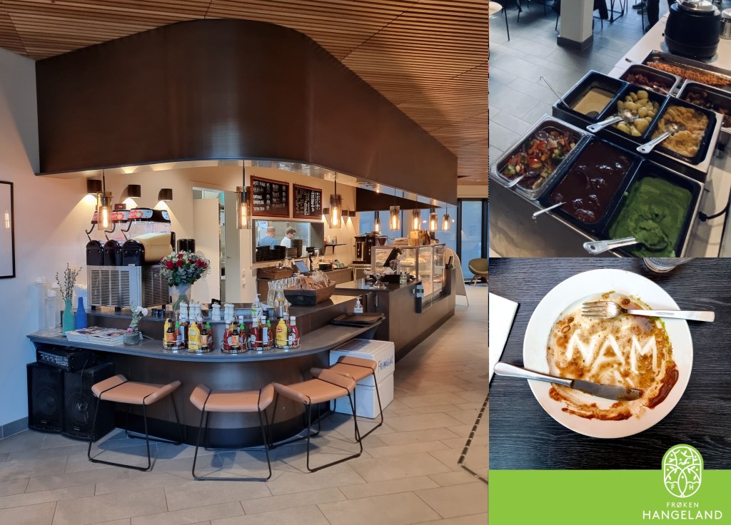 En medbragt 12 åring og hennes eldre bror på 15 ble stille når de spiste. Når de hadde tømt sine tallerkener sier de i kor “Dette var godt!” Ikke ofte en hører det fra et par tenåringer, men her var det skryt fra hjertet til dette lille spisestedet. Og de fortjener det. Frøken Hangeland ligger godt gjemt inne i Strømmetunet. Den nye Dementlandsbyen som har vunnet arkitektkonkurranser og nabolagets hjerter. Like innenfor resepsjonen til Strømmetunet ligger den. En lang fristende kake og smørbrøddisk gliser i mot oss. Sugling er ikke bra, men den er vanskelig å holde unna her. Jeg hadde hørt et rykte om at maten var god så vi gikk innom for å bestille bord til søndagsbuffeten. Bare 200 pr. hode. Min kone skal ikke ha melk og gluten så vi hørte om innholdet i diverse sauser og stuinger. “Det meste inneholder jo det”, sa kokken, “men når kommer dere, så kan jeg lage noen kjøttkaker og en saus til laksen og en brun saus til oksehøyryggen og lammekjøttet som ikke inneholder verken melk eller mel.”