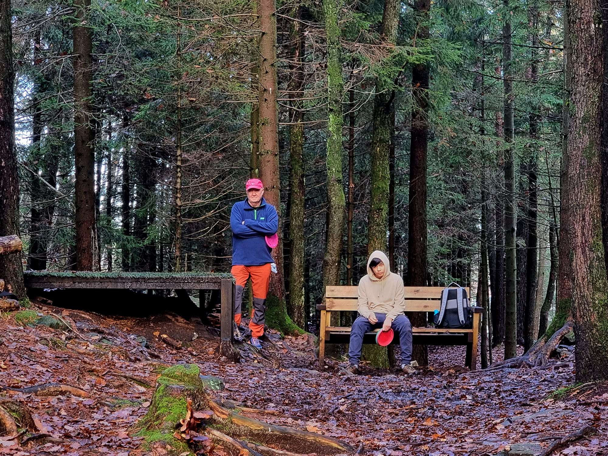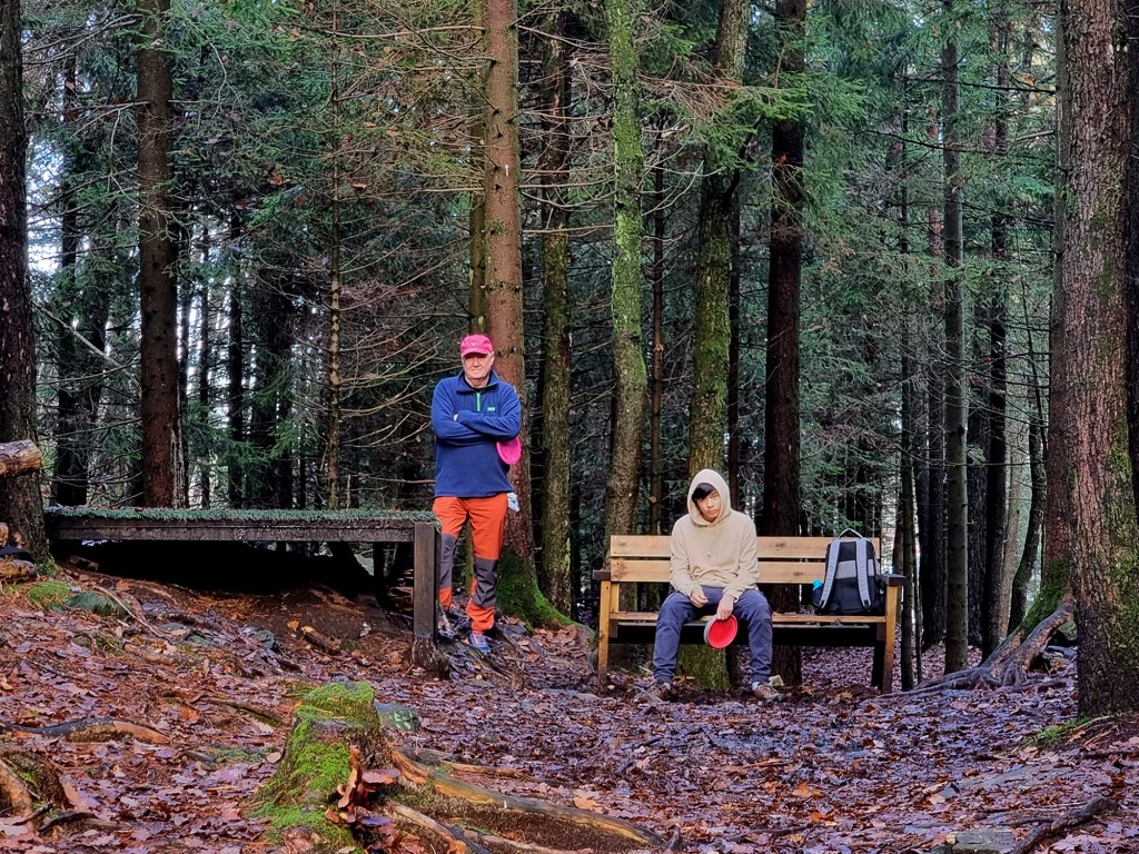 Det er deilig for en gammel kropp å ha funnet en idrett som innlemmer benkesitting som en del av det sportslige opplegget. For nesten uansett når på døgnet man går bort til Sukkevann Frisbee-golf bane så er det heldigvis andre der. Mange andre. Og det betyr at vi, ved de ulike utkast platåene, TEEene, må vente til de foran er ferdige. Og det er der benkene kommer inn. Riktignok av den harde sorten, men sofa med pledd er kanskje for mye for langt. Det får vi vente med til vi kommer hjem igjen. Og venting er en sosial ting her i de ødelagte barkers skog. Vi deler våre elendige erfaringer og talent med de som har godt talent og eminent teknikk. Egentlig tror jeg vel at jeg har kjøpt kun slike mandagsbrett. Feilproduserte uten mulighet til å bli kastet der de skal. Derfor kan ikke jeg beskyldes for mine høye poengsummer i en sport hvor minuspoengene teller. Det er en sosial sport. Mye latter og frustrasjon og enda mer latter på grunn av frustrasjonen. Alle vi treffer i våre benkesliter perioder er hyggelige. Helt topp. Skulle bare ønske jeg traff like mange hyggelige kurver som folk.