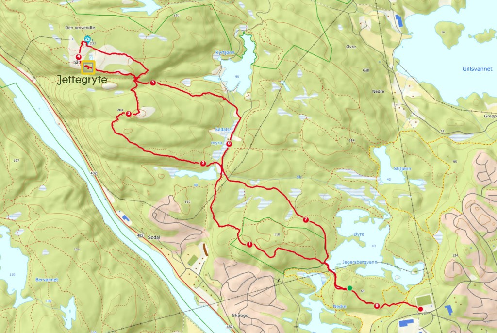 Og ikke langt fra” Båden” sa veiviseren at vi måtte ta en titt på “Gryda”. Og der var den. Like ved stien. En underlig plassering av ei Jettegryte. Høyt oppe på heia i bratt terreng var det ei dyp gryte i fjellet. Sikkert et par meter dyp. Så her har det i en fjern fortid ligget og rullet og gnisset og slipt en stein. Etter hvert så mye at det ble til ei gryte i fjellet. Som vi nå tittet ned i.