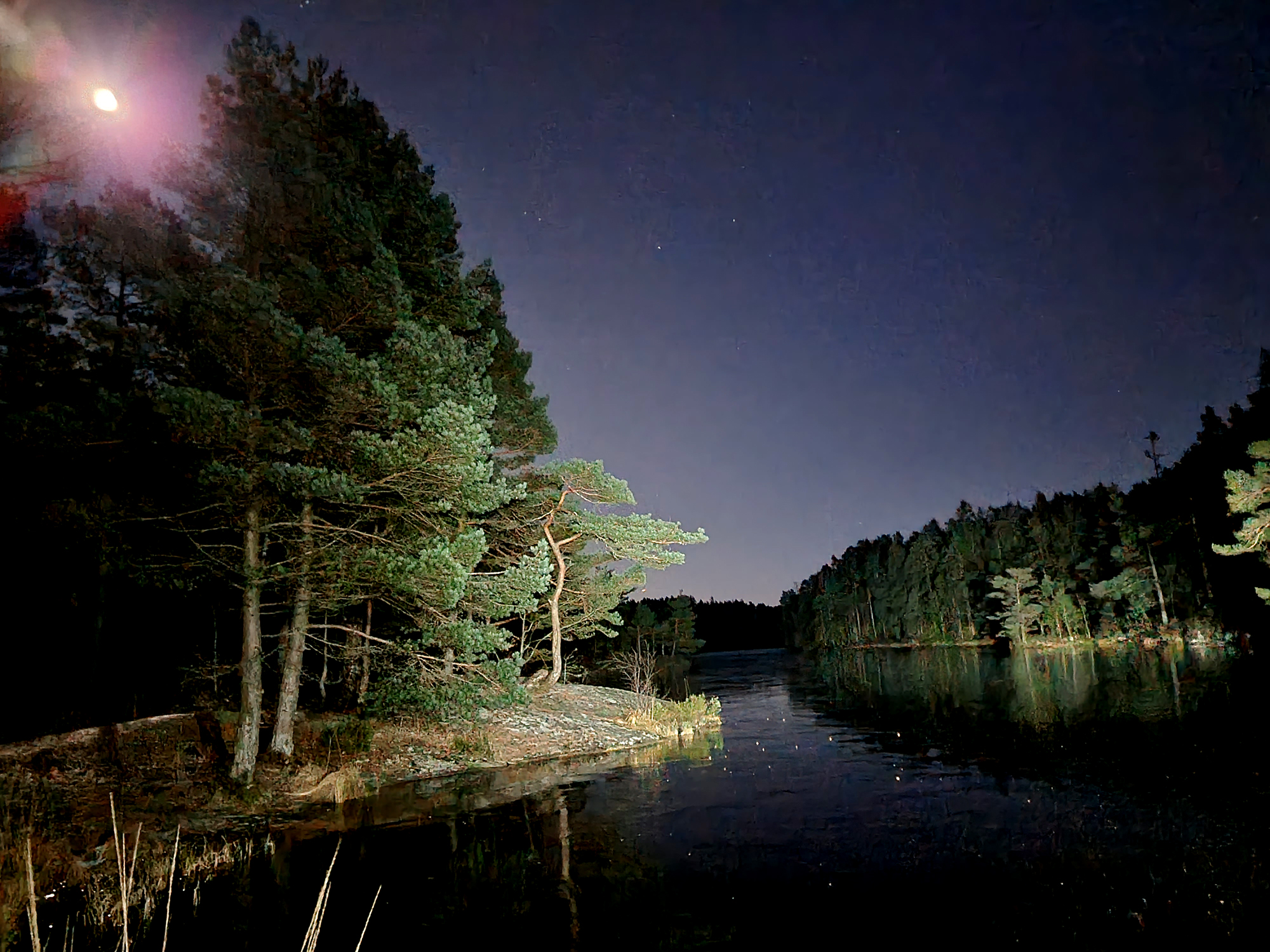 Med piggene ute tok vi turen inn i mørket igjen. Denne gangen startet vi på Eg og gikk langs Otra i sene kveldstimer. Veien og stien er perfekt helt til den ikke er det. Men med piggsko på hele gjengen overlevde vi greit. Vi så restene av den gamle pumpestasjonen. Fra den gang noen forsøkt å tømme Otra for vann. For så å kunne gå tørrskodd for å plukke laks fra elvebunnen. For sent oppdaget de den gang at det ikke var dumper nok oppe i Bymarka til å pumpe vannet opp i. Sikkert en som var like god i matte som meg som hadde regnet på akkurat det. I alle fall tror jeg det er derfor det er rester etter en pumpestasjon der oppe langs Otras bredd. Vi fikk og se en skikkelig natt-laks i elva. Den stod der motstrøms og kikket rart på oss.