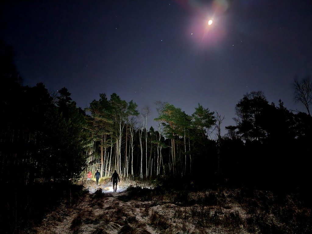 Turen er fin en måneskinnskveld, og skogens lille melisdryss av snø gjør det hele lysere og vakrere. Frosten i bakken gjør at du kan gå over-alt uten surkling i skoa. Men piggsko anbefales. Frosne bekker med litt snø oppå kan være glatt for eldre herrer som oss. Bærvannet rundt kan gås på mange måter. Velg din.