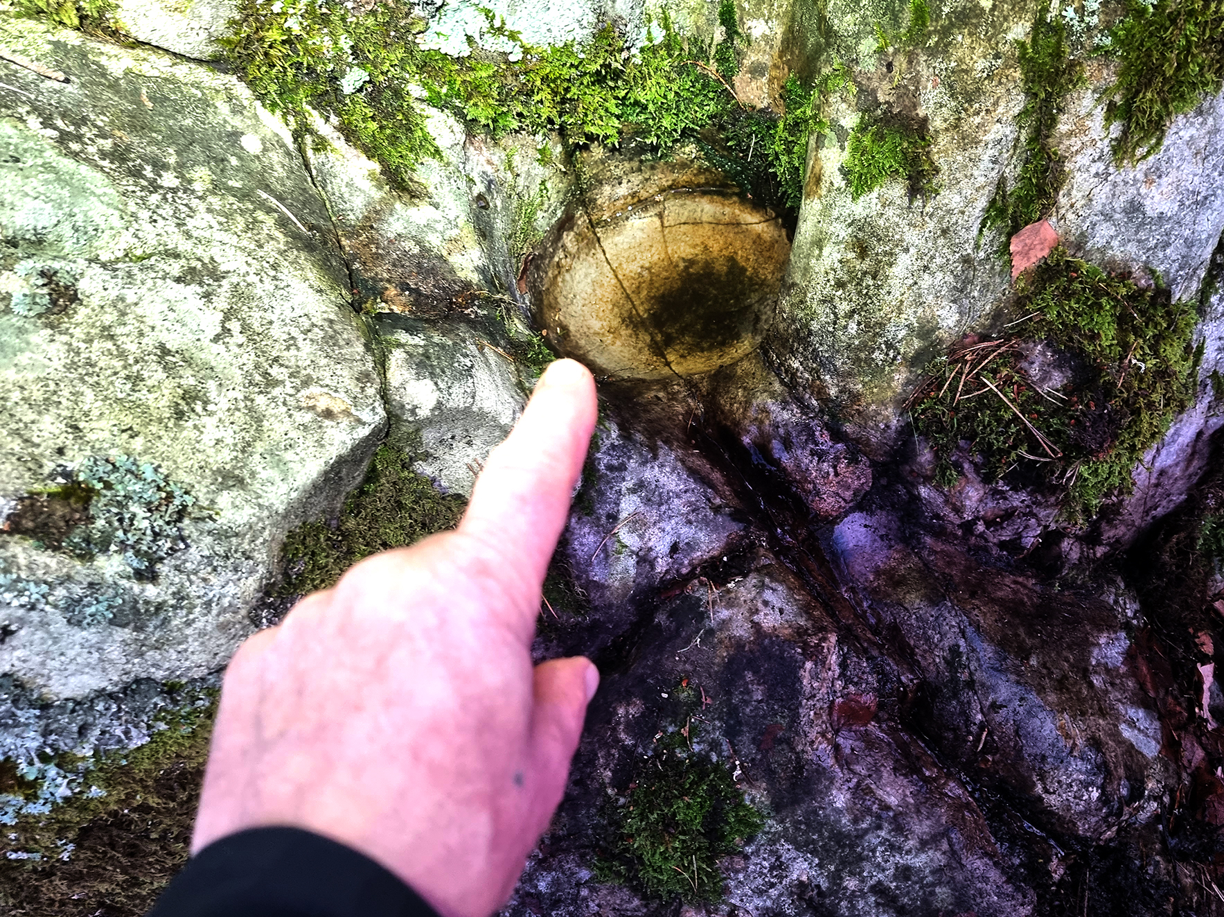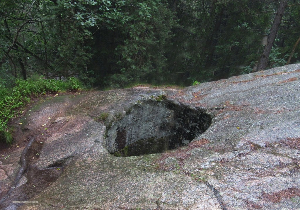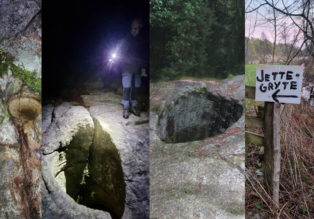 Jeg vet om tre, men det er sikkert fler. Det er fasinerende med slike naturskapte store og små gryter. I Nissedal og Brokke finnes det digre naturlige badeland. Skapt av stein og is over ganske så lang tid. På turer i skog og lier er det fint å stoppe opp og tenke litt ved en slik jettegryte. På middag. På livet. På tiden. Hvordan den ble til. Ved Gråmannen innenfor Kjerrane er det en stor en. Og dyp nok til at det er gjerde rundt den. Like nedenfor Omvendte Båt er det en fin en. Og nå så jeg jaggu meg en til. Bitteliten og ikke særlig dyp. Like ved Støletjønna i Randesund. Det er sikkert fler, og om noen vet så si i fra.
