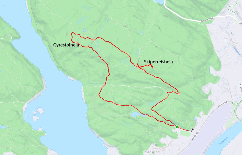 Turen har jeg tatt før og den er fin og tung med noen svært bratte oppforbakker. Men vi tok pingleruta. Vi gikk motsatt vei. Går du over Skiperreisheia først kommer stigningene litt her og der. Går du derimot raskeste vei opp mot Gyrestolheia blir du garantert varm og får garantert oksygenmangel om du er over 12 år gammel. Vi burde ant tegninga da vi passerte store hauger med tømmer langs starten av løypa. Der stien hadde vært var det nå to bekker av gjørme. En Tømmerskogsmonstermanskin hadde vært på færde. Etter en stund fant vi stien igjen og vi hoppet glade innover og litt oppover. Skiperreisheia har fin utsikt til vanlig. Men ikke i går kveld. Tåka hadde lagt seg. Vi gikk videre innover og fortsatt litt oppver. Det ble mer og mer glissent mellom trærne. Helt til det ble helt glissent. Langt inne på heia hadde hogstmaskinen kost seg. Den hadde fjernet alt av trær og stier og blå merker og kledd skogbunnen med kvist og kvas. Ikke akkurat lettgått. Og så var stien nok en gang gjort om til to gjørmete bekker. Vi fant Gyrestolheia med utsikten som var like grå som tåkeheimen. Og vi fant stien igjen og gikk ut og inn av nyhogd skog helt til vi var nede på veien igjen.