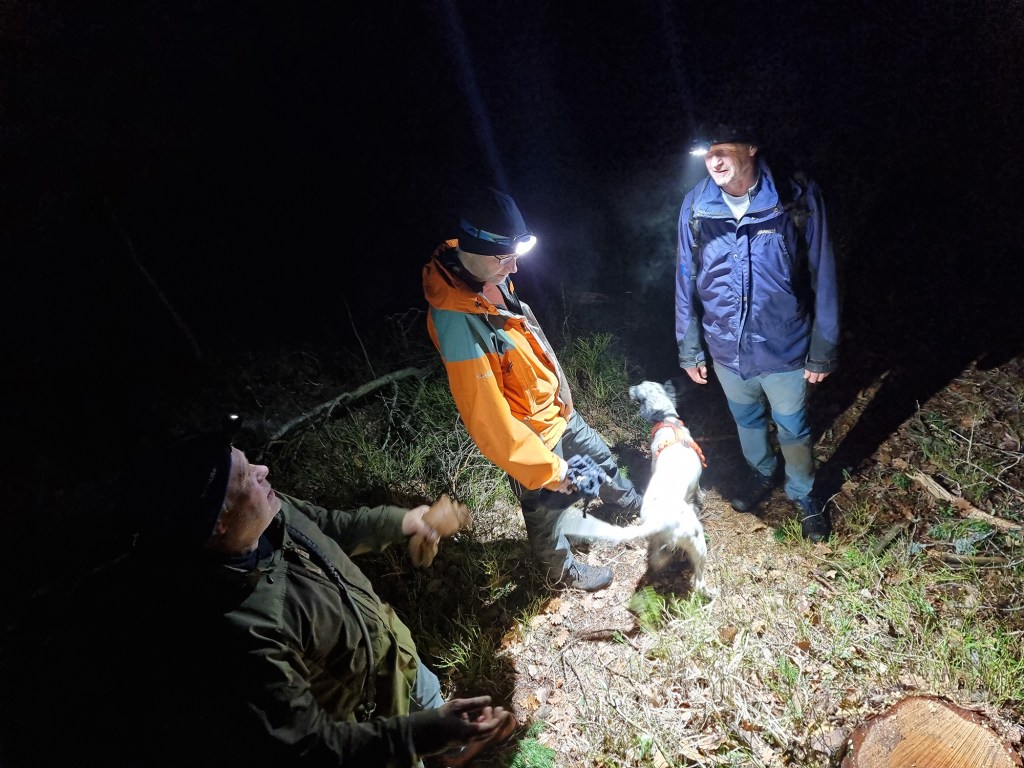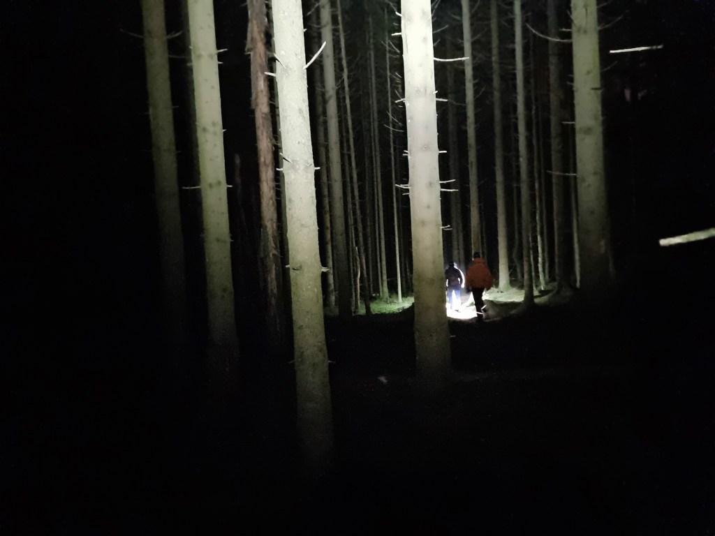 Vi så også en hare som kom hoppende. Den har ikke helt fått med seg klimaendringene så den lyste godt opp i skogen.