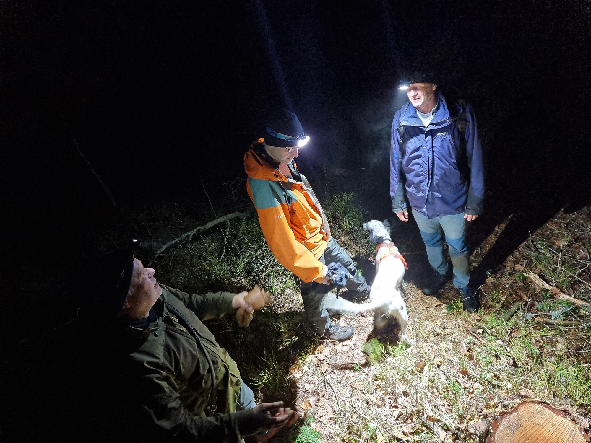 Vi så også en hare som kom hoppende. Den har ikke helt fått med seg klimaendringene så den lyste godt opp i skogen.