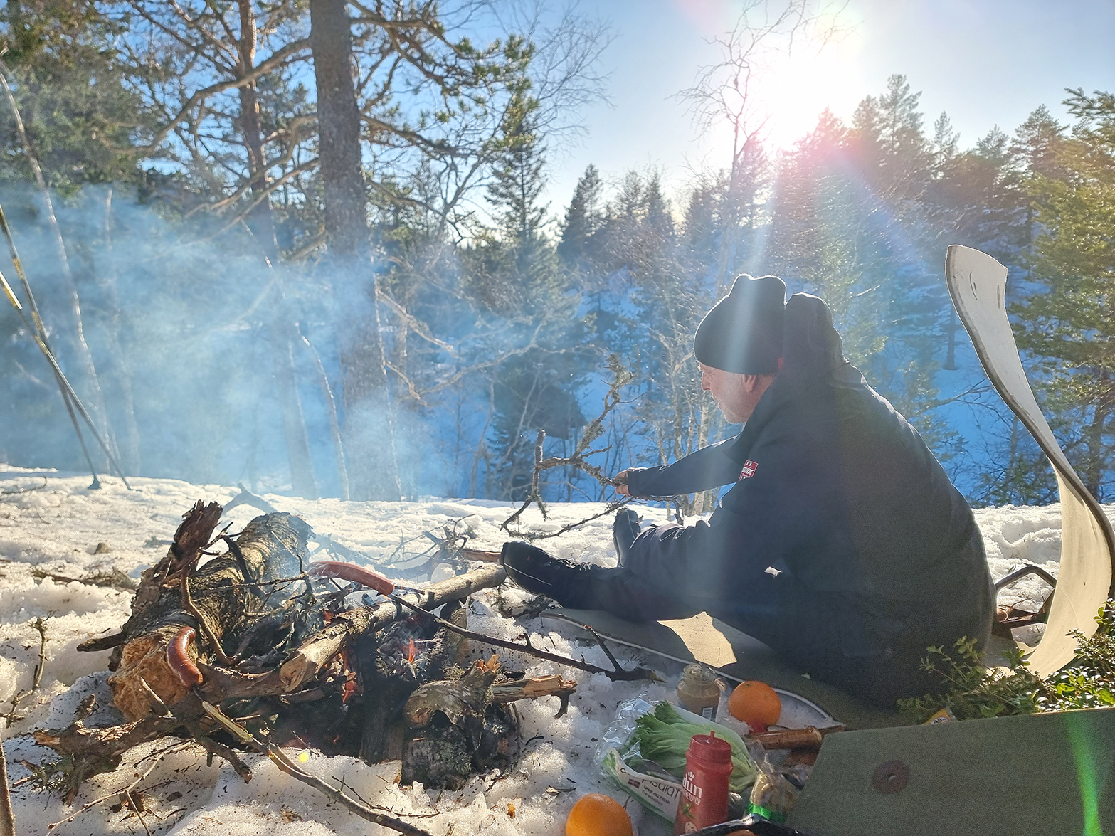 I sekken min hadde jeg pølser og lomper og tilbehør. I sekken til Arild var verdens største sitteunderlag. “Vi skal ha det godt ved bålet” sa han. Inne i skogen fant vi en semilun krok og fyrte opp med nyknekt gammel furuved og never fra et hjelpsomt bjørketre.