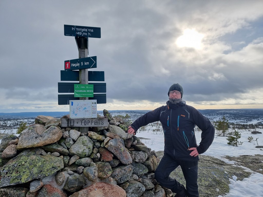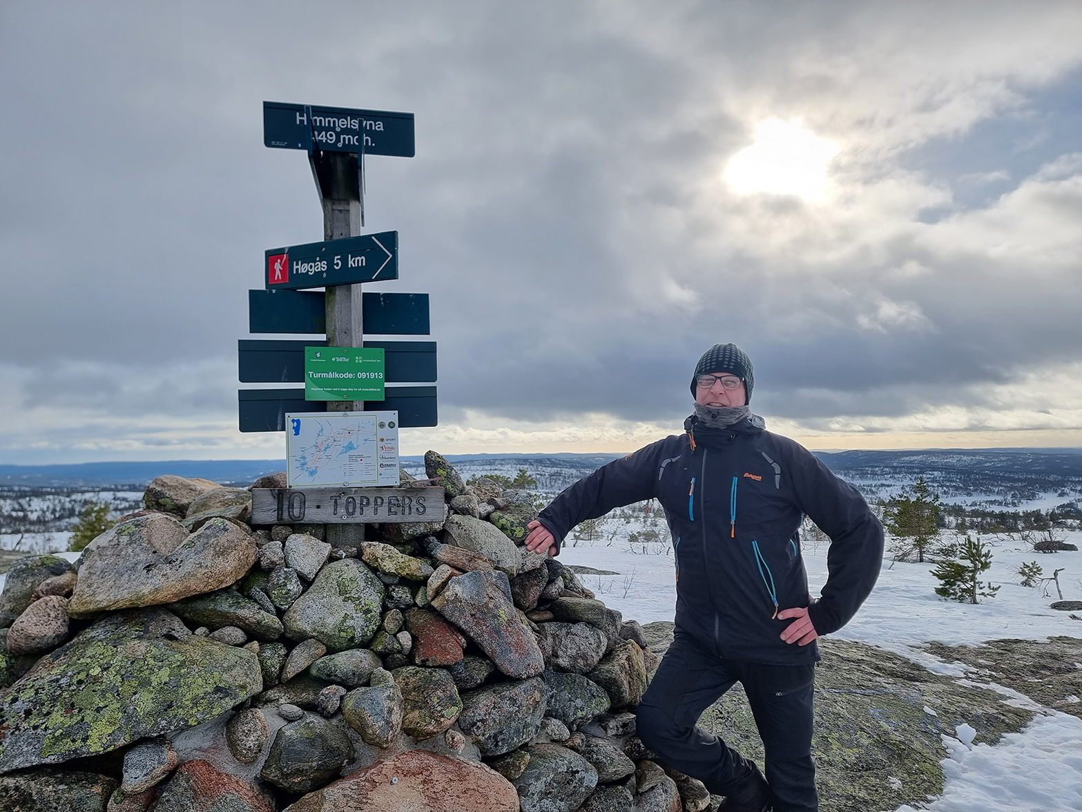 Etter frokost neste dag gjorde vi et tungt valg. Eller valget var lett. Resultatet var tungt. Himmelsyna ble målet for turen. Et fint utsiktspunkt som jeg har vært oppe på for 30 år siden en gang. Turen opp har jeg tydeligvis fortrengt siden den gang. For løypa går ganske flatt innover helt til du står ved foten til Himmelsyna og et skilt forteller at det er bare 1,5 km igjen til topps. Men de 1,5 km går omtrent rett opp. Det var bratt og glatt og hardt og svett. Men vi kom opp og vi nøt toppen.