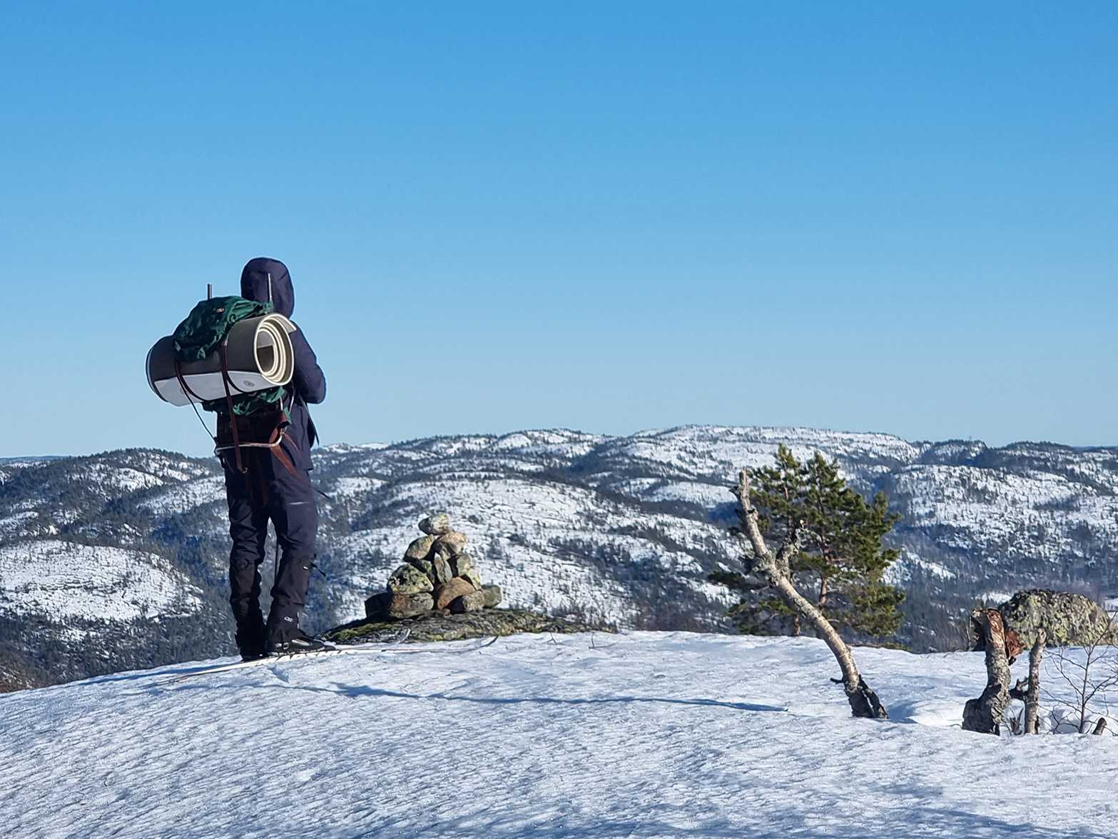 Foreldrene hans kjøpte hytta for lenge siden. Og siden har den vært slik. Ikke strøm. Ikke vann. Bare kos. Hytta ligger på Gautestad, 1 drøy times kjøretur fra Kristiansand. Og siden vi ikke har snø i Kristiansand har de fått dobbelt så mye der oppe. Det lå sikkert 1 meter hard snø i terrenget. Hytta har parkeringsplass ute ved veien og vi må bære litt og skli litt for å komme inn i varmen. Skjønt; varmen? Hytta var kald. Sofaen var kald. Teppene var kalde. Ovnen var kald. Alt var kaldt. Men vi fyrte fort opp og varmen skulle langsomt komme snikende, tror jeg. For vi kom ikke opp hit for å sitte i hytta. Det var sol og skyfritt og min eminente vert ville vise meg den største høna jeg noen gang kom til å få se. Så vi la av sted. Jeg på treige felleski. Han på bakglatte ski fra i fjor. Men tur er tur og vi føyk av gårde i sneglefart. Vi kom opp på Høna. En fin liten topp sånn ca 640 moh. Utsikten var lang. Det var hvite snøkledde heier langt langt innover.