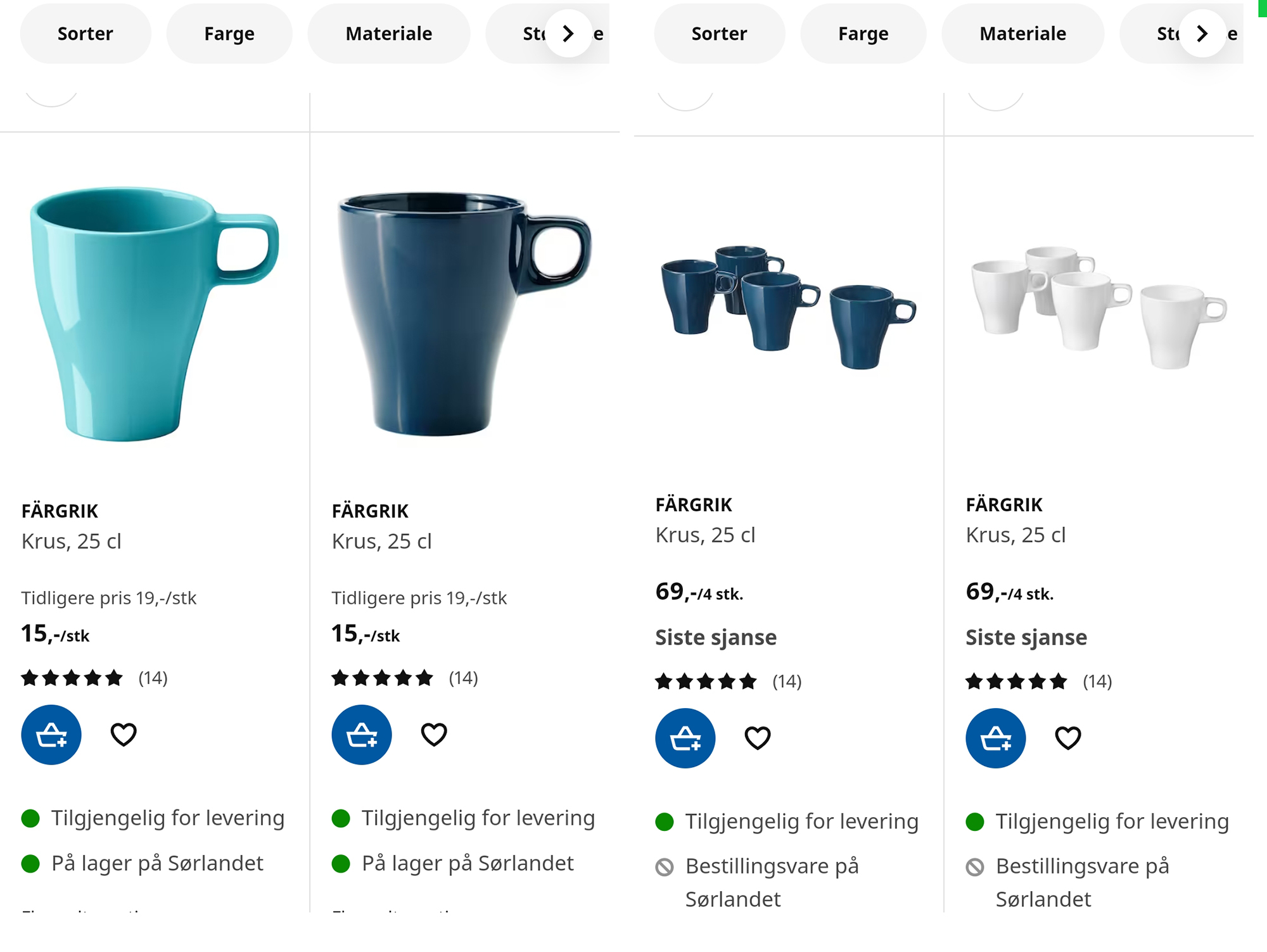 Kanskje jeg skulle kjøpt noen ting og gikk inn på nettbutikken til Ikea. Der fant jeg fort kaffekoppen Fargerik til kun 15 kr stk. Men så så jeg de hadde tilbud på 4 pakning også. Kanskje jeg skulle kjøpt to 4-pakninger i stedet for 6 enkeltkopper.