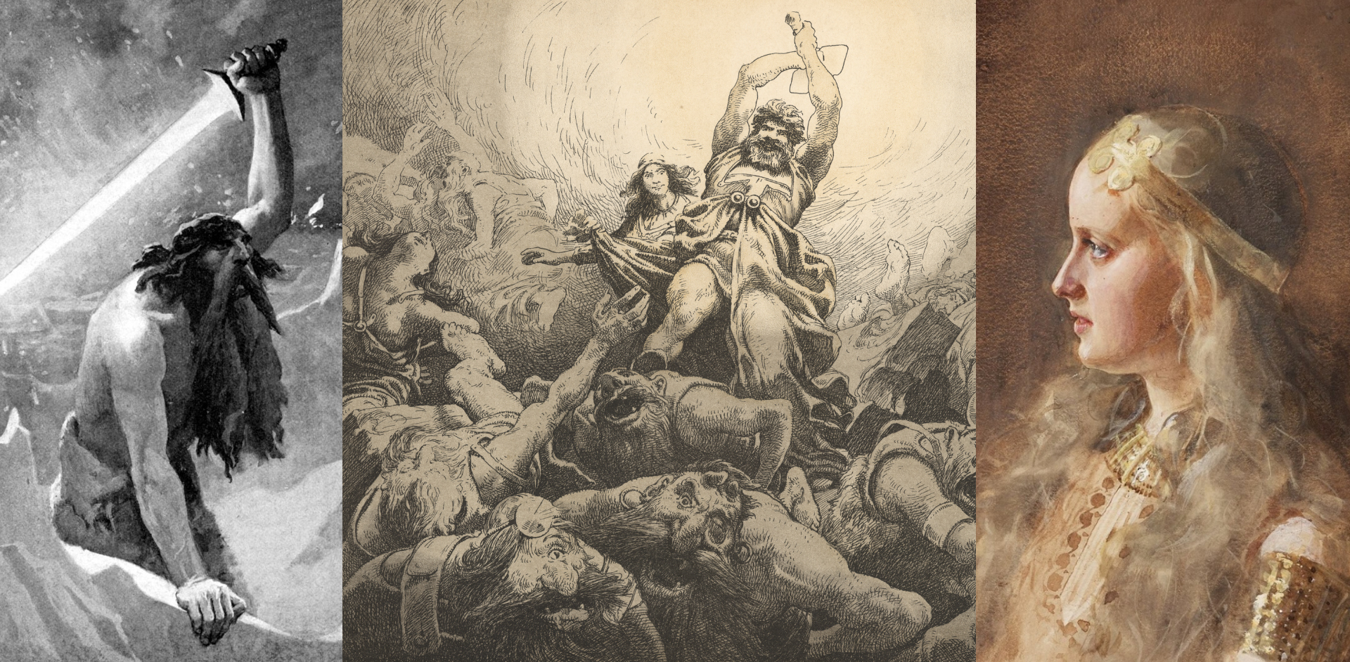Jætten Surt med flammende sværd. Thor hos jætten Trym og Jættekvinnen Gunlød.