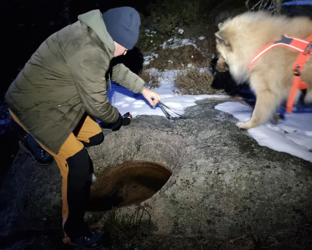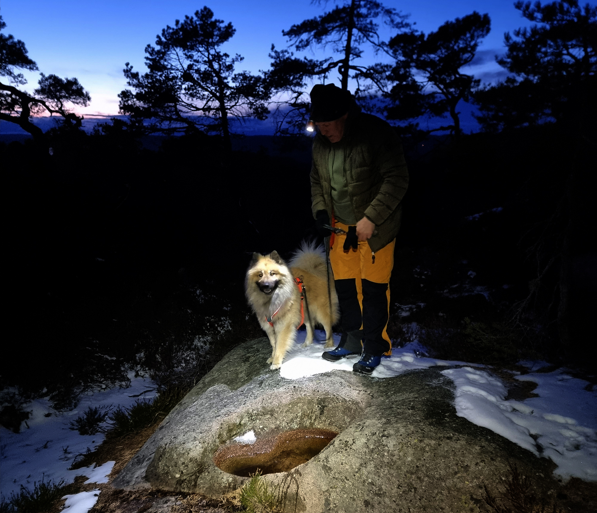 Jeg er fasinert av Jettegryter. Jettenes kokekar. En ivrig turgåer fortalte om denne gryta opp på Lille Redalshei. Jeg har gått forbi der mange ganger uten å vite. Men med en god venn og en jettegryte-sporhund vi lånte dro vi av sted en sen kveld. Vi fant, vi fant. Fornøyde nådde vi målet for turen. Gryta var kald, full av is, så det var en stund siden jettene har brukt den.