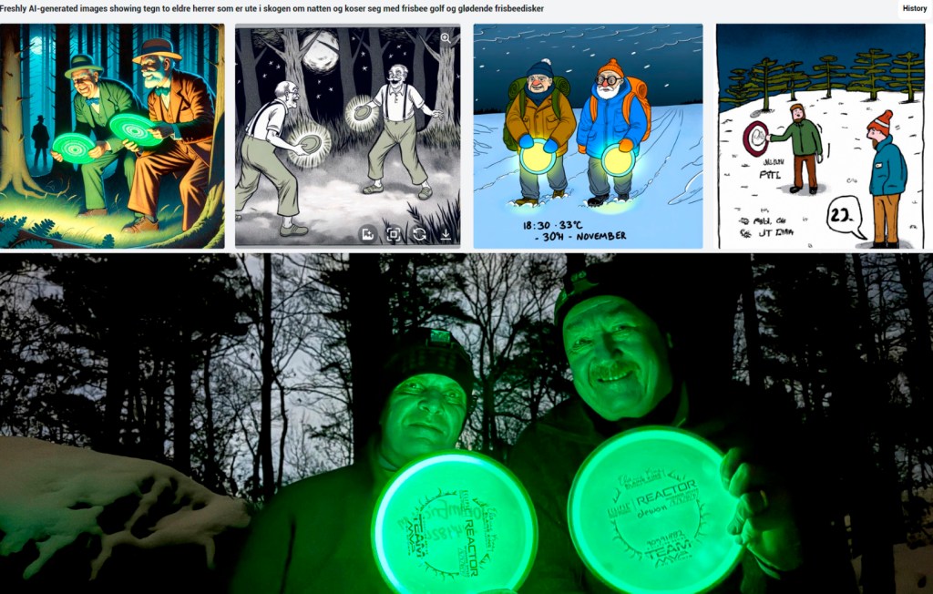 “Er det lurt av to menn i sekstiårene å gå ut klokken 18.30, 30. november for å spille frisbee golf med selvlysende disker mens det er mørkt og minus 3 grader og snø på bakken. Og hvordan vil du best visualisere dette scenariet.”
