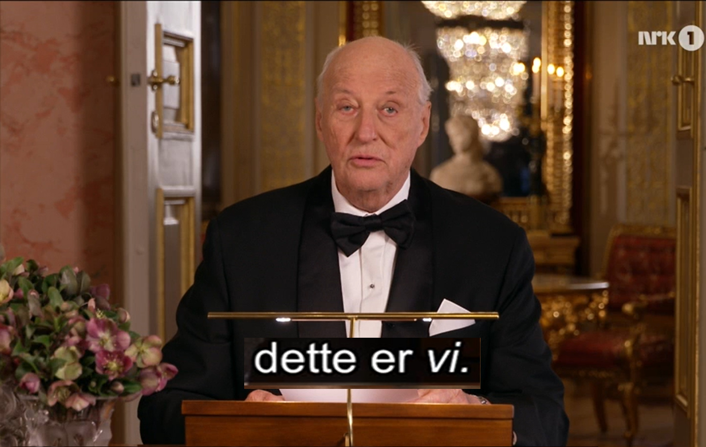 Kongens nyttårstale satte seg fast. Hans viktige ord; Vi, ble sagt mange ganger i ulike sammenhenger. Ikke dem og oss. Vi. Det er vi som er vi. Alle oss. Også kongen. Han er vi og bryr seg om vi som bor her. Og også de som bor andre steder. De er også vi. Han nevnte også det å lytte til andre. Prøve å forstå. Prøve å innlemme alle i ordet Vi. Da kan vi håpe på å løse problemer uten vold, utenforskap, rasisme og mobbing. Kong Harald er en gammel mann som har besøkt nesten alle kommuner i Norge. Det er vel en fin måte å si at vi er sammen. Han og alle i Norge er vi. Noen steder i verden kjempes kriger hvor lederne oppfordrer innbyggerne til å ikke si vi, men oss.