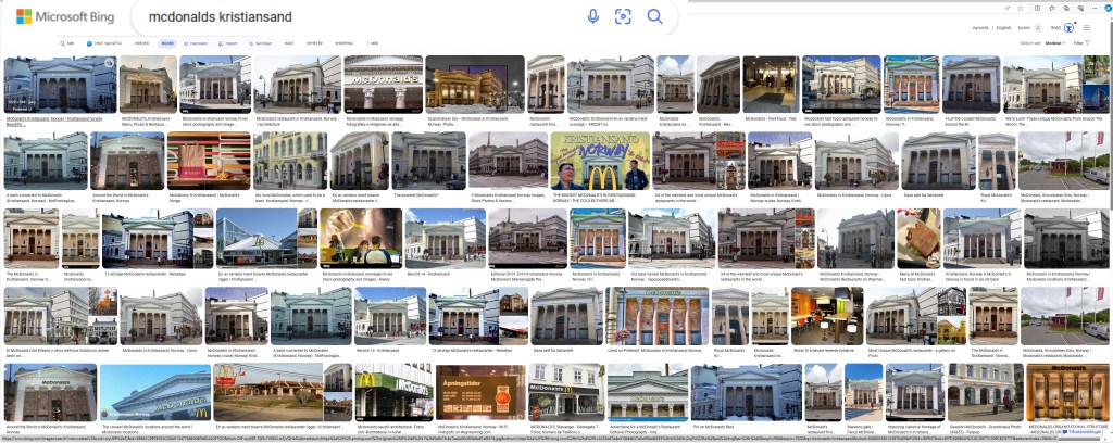 Jeg har kontor like nedenfor McDonalds i Kristiansand og ser alle cruiseturistene som smiler og peker og tar bilder av det vakre bygget med McDonalds navnet over døren. Bygget er fint men ikke fint nok til at turister fra større land enn Norge ville stoppet å tatt bilde av det. Ikke mange i alle fall. Og McDonalds? Hvem tar bilde av ei burgersjappe? Ikke mange her heller.