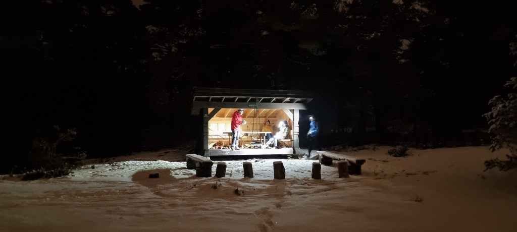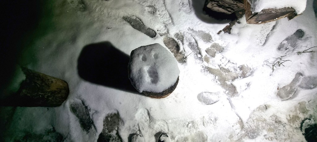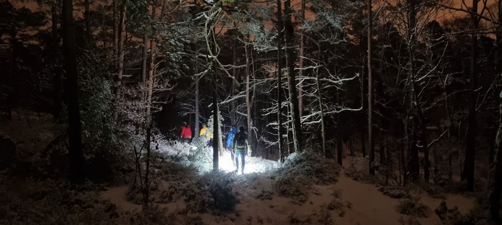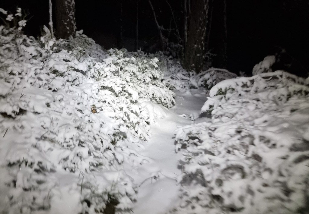 10 cm melisdryss over Bymarka i Kristiansand. Det er fint om dagen i lyset. Ennå finere i mørket. Vi gikk inn i Eventyret fra Svarttjønn i Baneheia. Eller kanskje det var forordet vi gikk inn i. For vi fulgte lysløypa bort til Bånetjønn. Det var først når vi kun hadde eget lys at magien startet. Det var blikk stille med kun ett bitte lite dryss av lett dalende snøkrystaller. Bakken var myk av snø og vi hørte kald nysnø knirke under skoene. Trær og busker og lyng og steiner var pynta i sin fineste hvite stas. Vakkert. Og snødekket demper alle lyder og det virker som vi går i en liten hvit boble innover i skogen. Vi gikk nesten 8 km denne kvelden. Føret var fint. Lite is under snøen. Av og til skulle vi hatt teknikken til Warholm for det var en del nedfallstrær som skapte hinder i løypa.