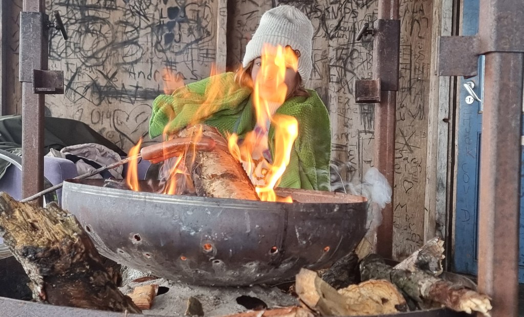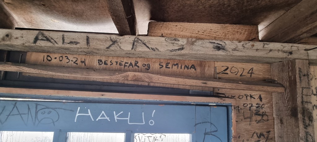 Men så var det inn i hytta der oppe. Jeg hadde ved i sekken og skulle fyre opp. I bålpanna var der allerede glør. Noen hadde vært der før på dagen. Deilig. Da gikk det fort å få futt i et fint bål. Pølser og varme og smoothie ble nytt. Her var det 7 grader men føles som 22. Kos. Vi fant en ledig flis og skrev navnene våre i sot på veggen. Og vi fant navnene våre fra 2020 så vi har vært der før.