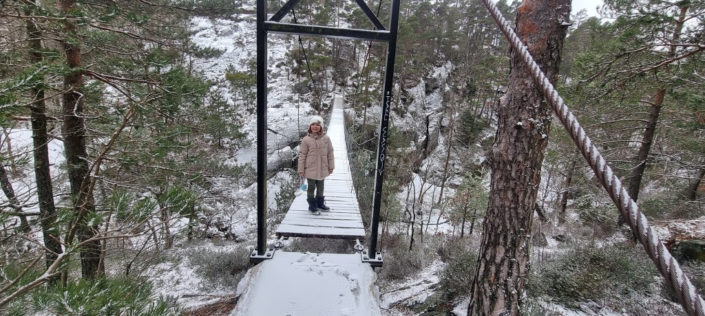 Vel oppe av bakkene kom vi til den spektakulært spennende hengebroa. “Hvor lang er den?” Hmmm. Uten noe å måle med måtte vi skritte den opp. 118 skolengder av bestefars sko fant vi ut. Så må vi måle skoen og gange litt opp når vi kommer hjem.