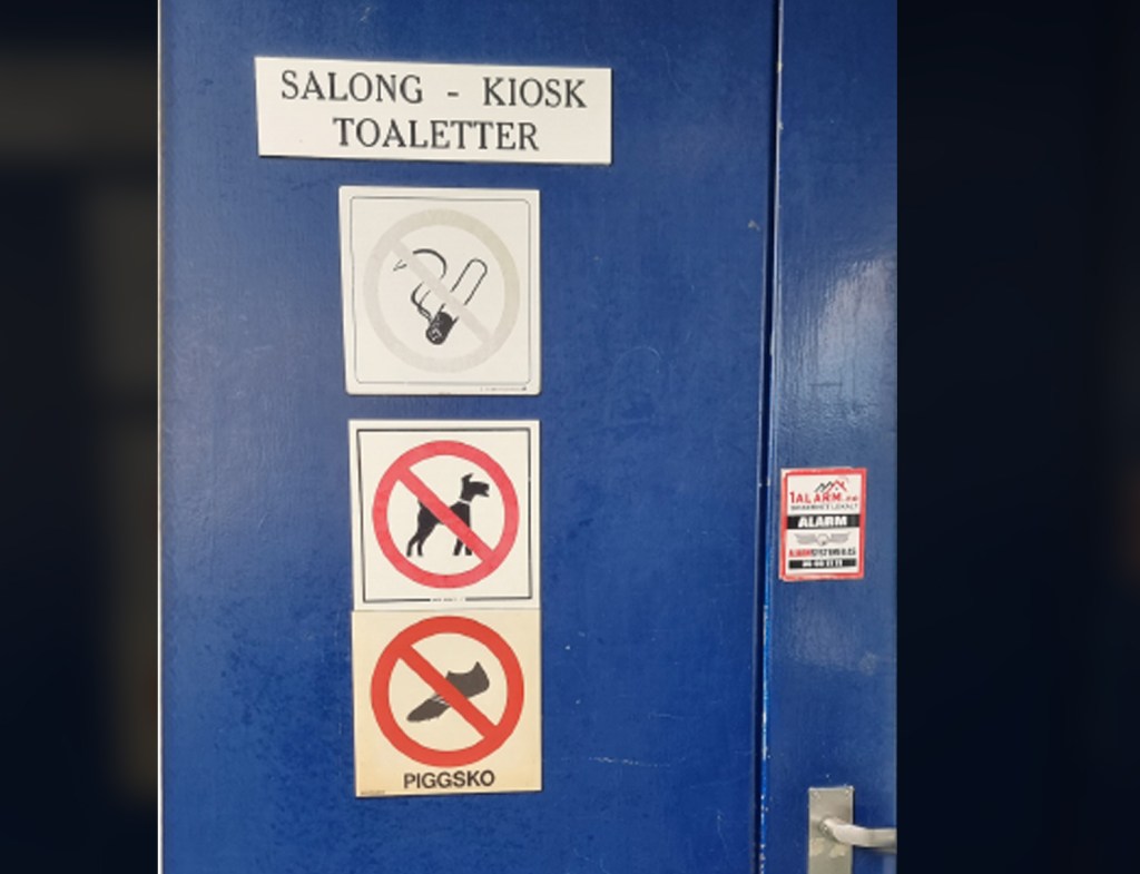 Her er det en kaptein på ei ferje som har sett seg lei på at unge Warholm ikke gidder å skifte sko etter at han har løpt i mål et eller annet sted. Det er jo vanlig at det er forbudt å røyke inne, og ganske vanlig at du ikke kan ta med deg hunder inn i en kafe på ei ferje. Men. Men. Men. Det er ikke vanlig å iverksette et forbud mot piggsko. Kanskje hekkeløperen hoppa over hekken på ferja uten å løse billett. Kanskje det bråker noe inne hampen når han springer og varmer opp på et bildekk av metall. Kanskje han setter merker i parketten i kafeen. Ikke vet jeg hvorfor skiltet er satt opp. Men det gir jo en pekepinn på at denne hekkeløperen har hytte et eller annet sted i Kragerøs vakre skjærgård. Men hvilken vet jeg ikke. Får speide etter oppfliste brygger.