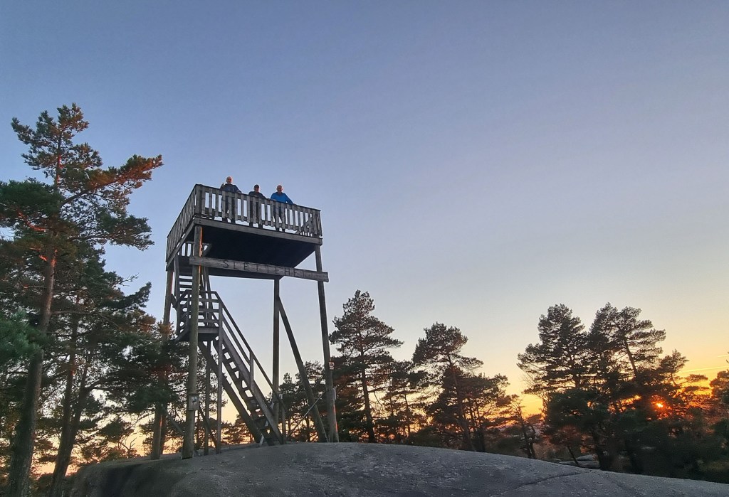Litt rart at sola skal være på sitt vakreste like før den forsvinner. Men slik var det i går kveld. Lavterskeltusleklubben nådde akkurat opp til tårnet på Slettehei i det sola sank ned bak horisonten. Vi stod der oppe i stillhet og nøt det lange øyeblikket. Og stillheten skyltes ikke bare mangelen på oksygen etter turen opp dit. For stigningen er steil. Lett småprat i bunnen av bakken stilner fort. Kun bergenseren i blant oss holdt det gående hele veien opp. Men så tror jeg kanskje at bergensere ikke trenger oksygen for å prate. Men vi kom opp alle fire. Turen er fin og utsikten fra topphytta ennå finere. Turen er ikke så lang så den passer fint en kveld etter jobb med fine folk. Og siden turen er så fin har jeg vært der før, mange ganger. Om vi får besøk fra langtvekkistan og de liker turer, tar jeg de enten med opp til Slettehei eller til Møvigknatten. Begge turene er overkommelige og spektakulære på hver sin måte.
