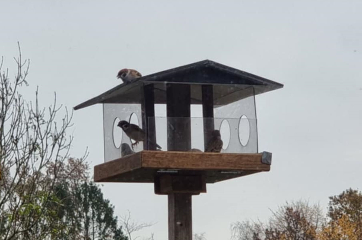 Fuglematehuset ble laget i pleksiplast siden vi hadde lyst å nyte synet av dem inne fra stua.