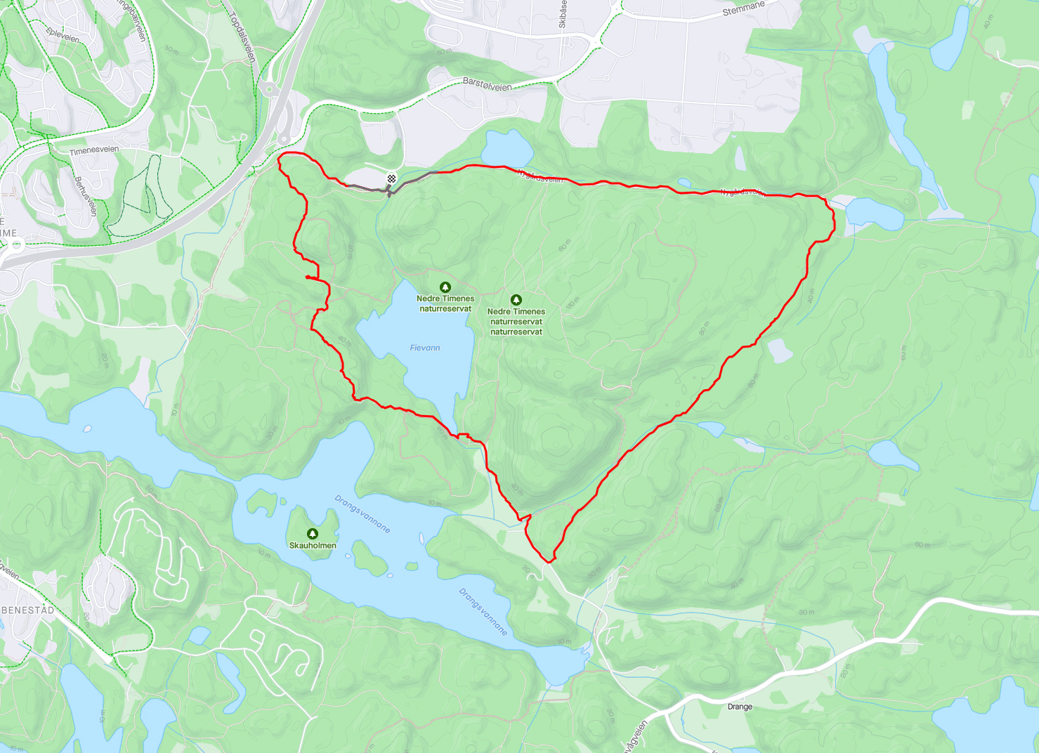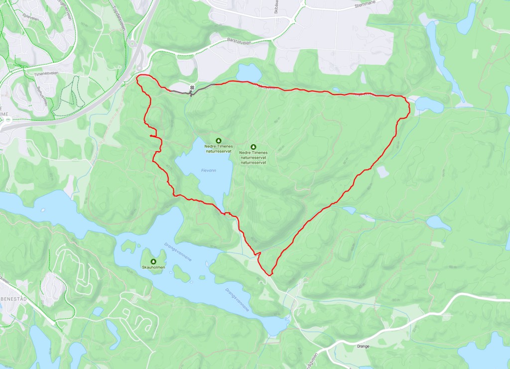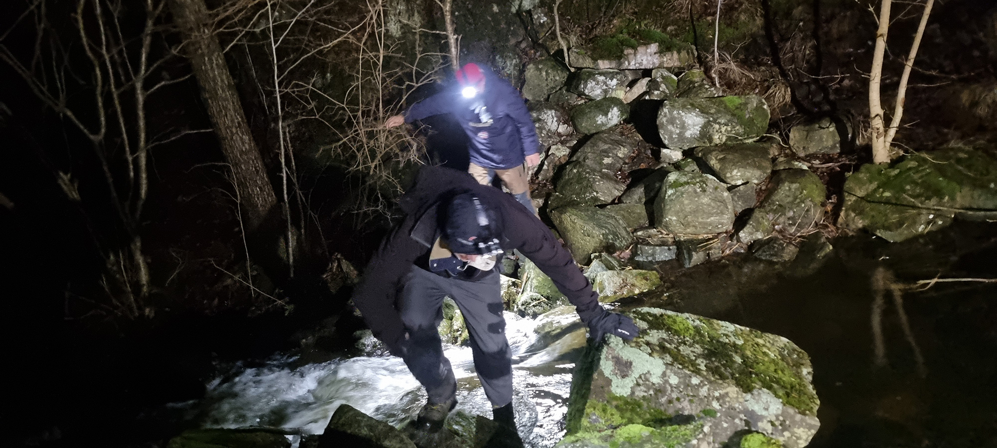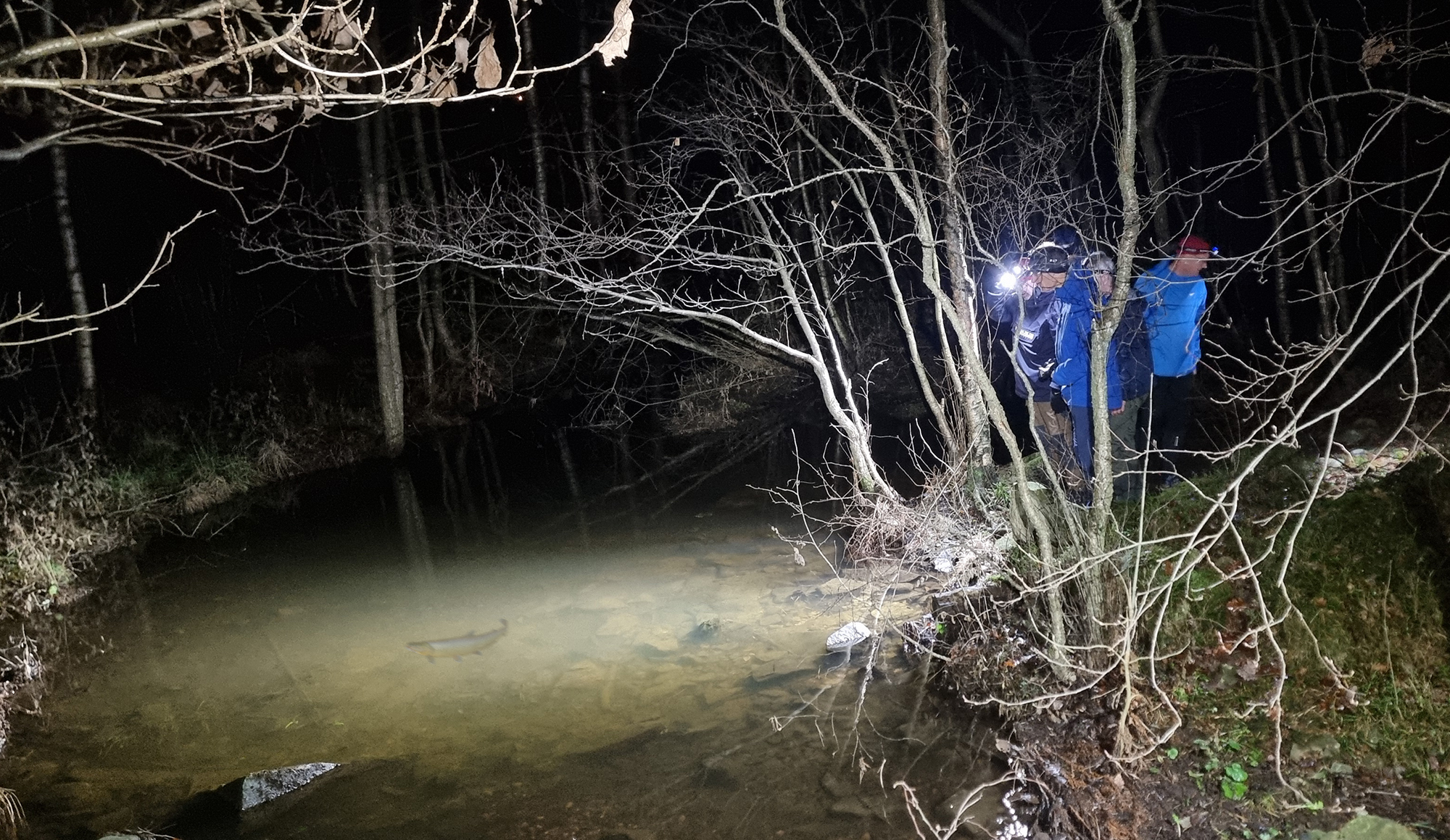 Det var ikke bare vi som var på tur i gårskveldens mørke. I den våte skogen, i buldrende bekker var det andre sleipinger som tok seg mer elegant frem enn oss tilårskomne menn. Jeg lar meg fasinere av hvordan disse fiskene i det hele tatt kan klare å komme seg opp alle småstrykene i bekkene som går helt ned til Drangsvann. De har verken fisketrapp eller heis langs ruten. Vi var heldige, vi så mange i det mørke vannet. For bekkemørket ble opplyst av hundesledehodelykter spekka med lumens. Mange av fiskene var ganske store der de plaska seg oppover bekken mot Bauetjønn. Beveren som bor der blir ikke alene de neste dagene. Turen fra parkeringsplassen innenfor Fordbutikken er lettgått, nesten. Litt opp og ned til en kommer ned til oset i enden av Fievann. Derfra er det nyrydda stier og kjerrevei hele turen fra Lykkedrange og tilbake til bilen. Om dagen er det fint å svinge innom Ruben med sin fine utsikt. Men for oss mørkemenn ble det mer innsikt enn utsikt denne kvelden.