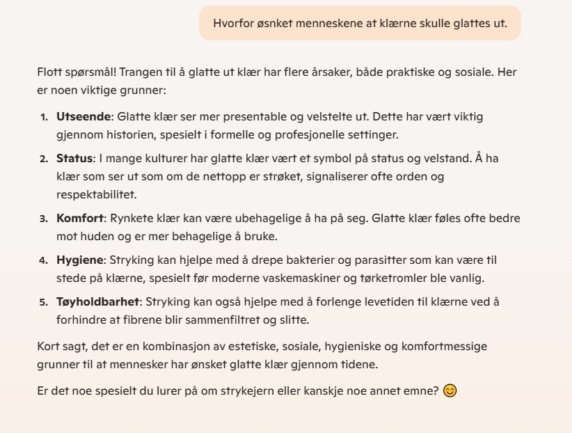 Jeg måtte jo spørre Ai om hvorfor vi mennesker trenger strykejern. Den syntes det var et flott spørsmål, selv om det hadde skirvefeil. Svaret jeg fikk overbeviste ikke meg.