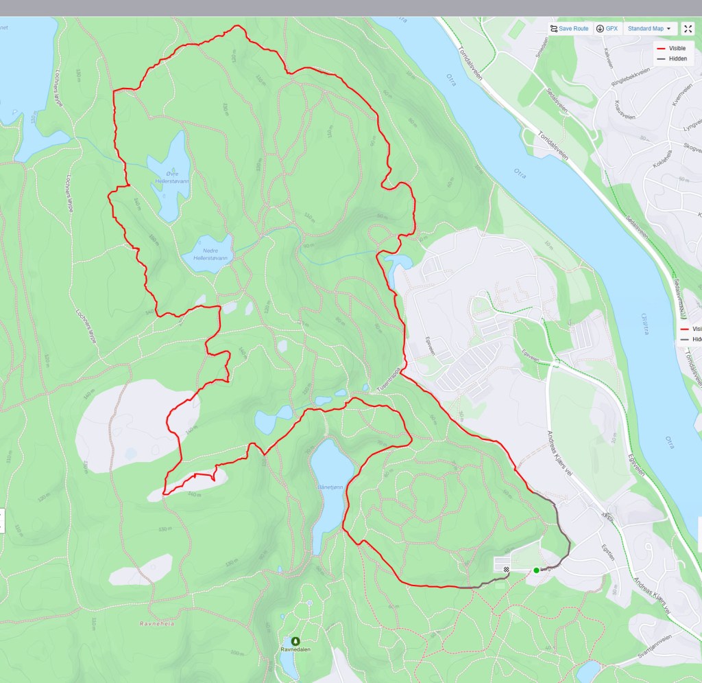 Det var stort sett tåkeprat hele veien i går. Lufta var så fuktig at det bobla når vi prata. Ikke rart at i hadde blaude konsonanter denne kvelden. Også vokalene ble ganske våde. Med start fra parkeringsplassen ved der Sykepleierskolen en gang lå la vi i vei langs kjærlighetsstien på Eg og opp i skogen bak det gamle stabburet bak sykehuset. Vi gikk forbi tusentrappene som sikkert Trump har gitt navn til, for det er bare sånn ca 200 trinn. Målet var bymarkas høyeste punkt; Hellerstønuten. Den er en av flere fine utsiktspunkt oppe på høydedraget der oppe. 166 meter over havet. Fra toppen kan du på en klar dag få flott utsikt over byfjorden i sør, Hesteheia i nordvest og Skråstadheia med Den omvendte båd i nordøst. Og litt lenger vekk så vi Mordor, eller forbrenningsanlegget på Dalane som det og kalles.