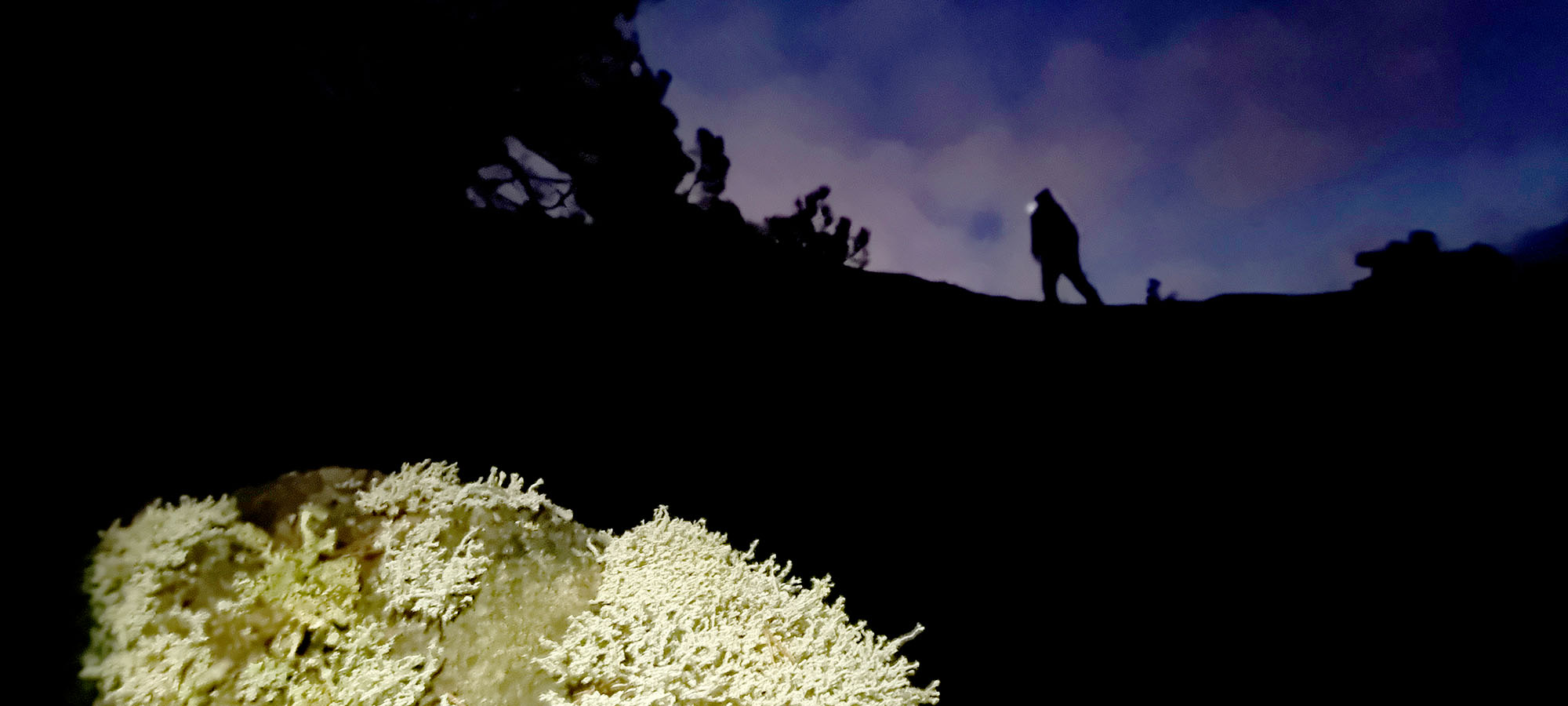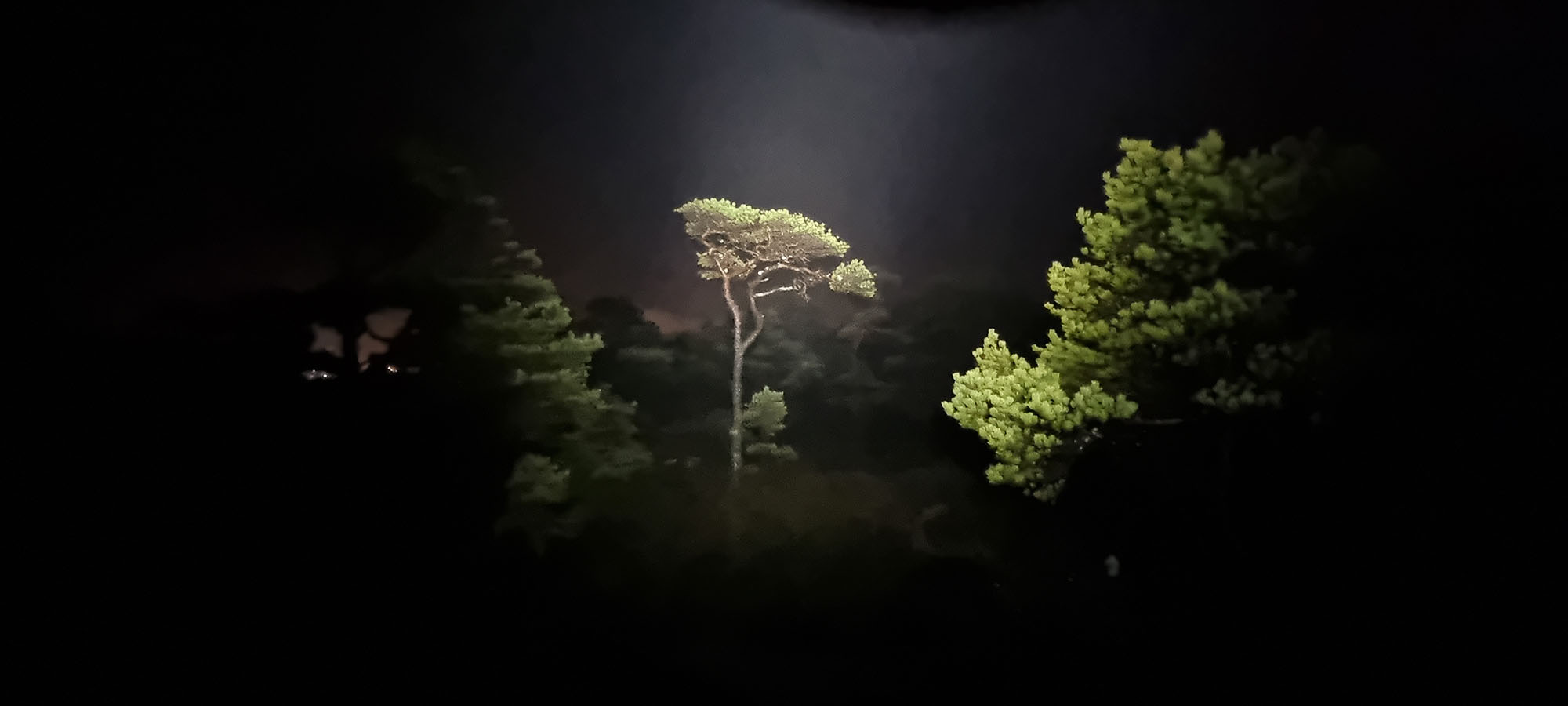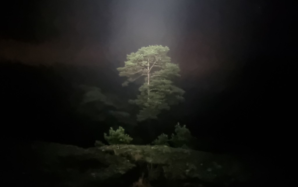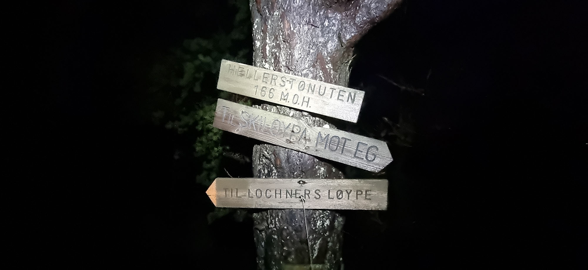 Men ikke på en tåkete kveld. Det er nå fritt for is og snø og vint å gå. Fortsatt blaut i bakken og i går blaut i lufta. Med sterke lykter i panna ble også vannperlene i lufta lyst opp. Det skapte magiske bilder i hodet. Nesten litt trolldom i lufta. Alt blir litt tettere. Lufta pakker seg rundt deg. Turen er fin både i lys og mørke og som vanlig har løypemannskapene gjort en god jobb med å fjerne trefall og merking av stier. Hill, hill og takk til dere.