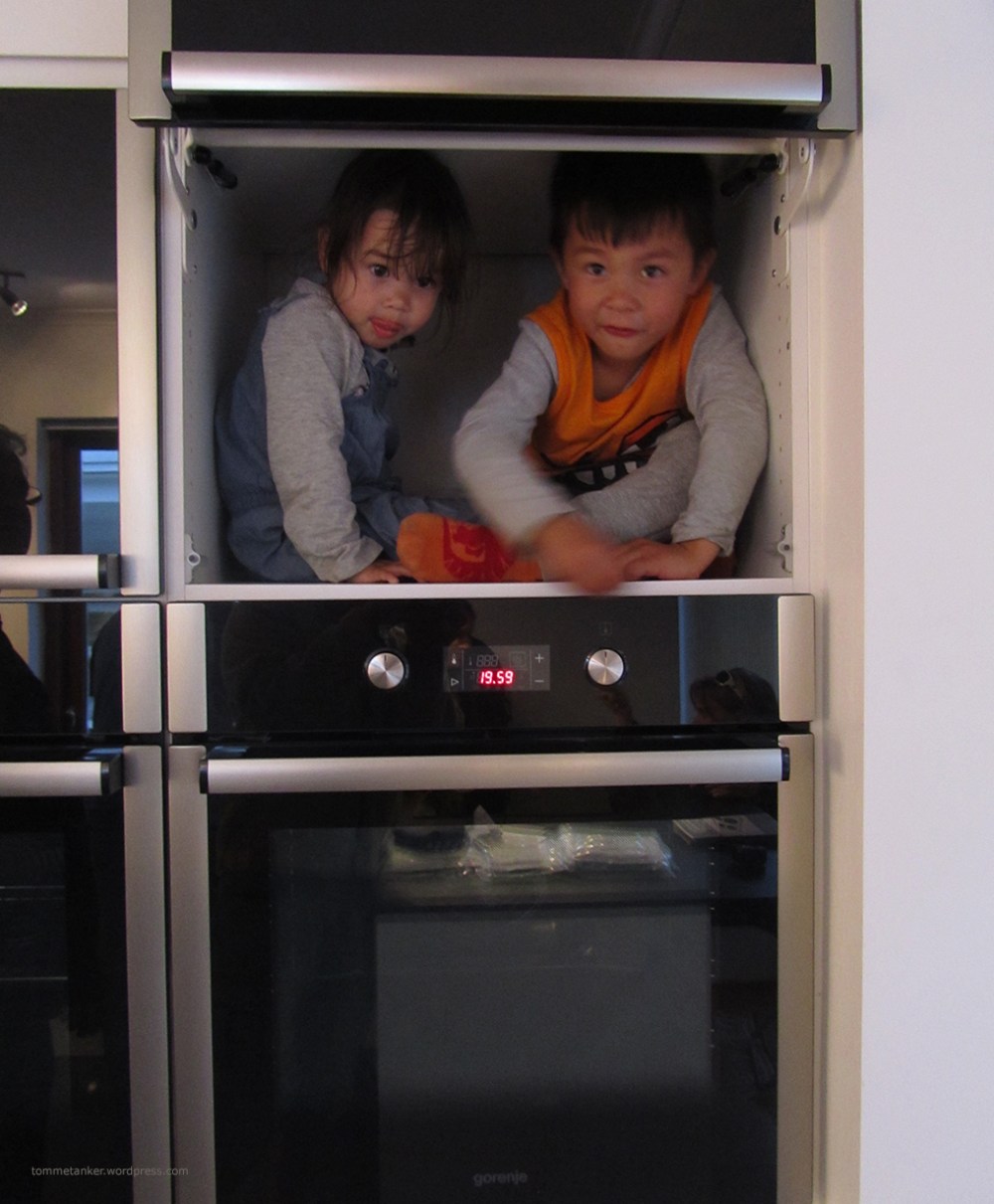 Endelig kom det forbanna uværet. Det de fleste hater, og fåtallet elsker. Snø, vind, vått og hærlig. Bygningsmassen kom ovenfra. Ferdigblanda hvit betong. Akkurat passe blaud. Vår store nye oppkjørsel ble overført til ett hvitt voksende fjell på den ellers så flate plenen. Større og større ble det. Faktisk så stor at vi kunne se at denne kunne inneholde ei hule. Og Stian tok ansvar. I splitter ny Norrøna jakke, som er varm og god i minus 20, satte han i gang. Det at det var sånn ca. 1 minusgrad førte til rask overoppheting innenfor jakkens isolerende dunlag. Han kunne bare putte hode i haugen og et stor hull ble smelta. Svigerbror og svigersøster kom susende og spader, hakker, hender og never ble ivrig benytta. Etter noen timer hadde vi renska nabolaget for snø og hytta var innflyttingsklar. 4 voksne, 2 barn, 5 mandariner og noen telys fikk plass. Og hytta var ikke noe hytte ifølge Lucas,- “Det er et hotell!”.