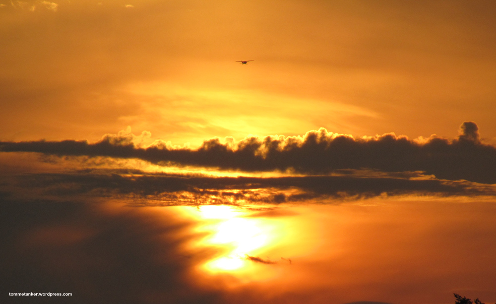 endrer solens lysbaner. Perfekt harmoni av solstråler og skyskygger. Jeg føler meg i ett med nuet. Tenk å kunne fly inn i den solnedgangen. Og så! Mine tanker var virkelige for andre. Det dukket opp en prikk på ett av bildene. Et fly. Tenk hvordan piloten har det. Styrespakene i handa. Roxette med Wish i could fly på øran. Gudd.