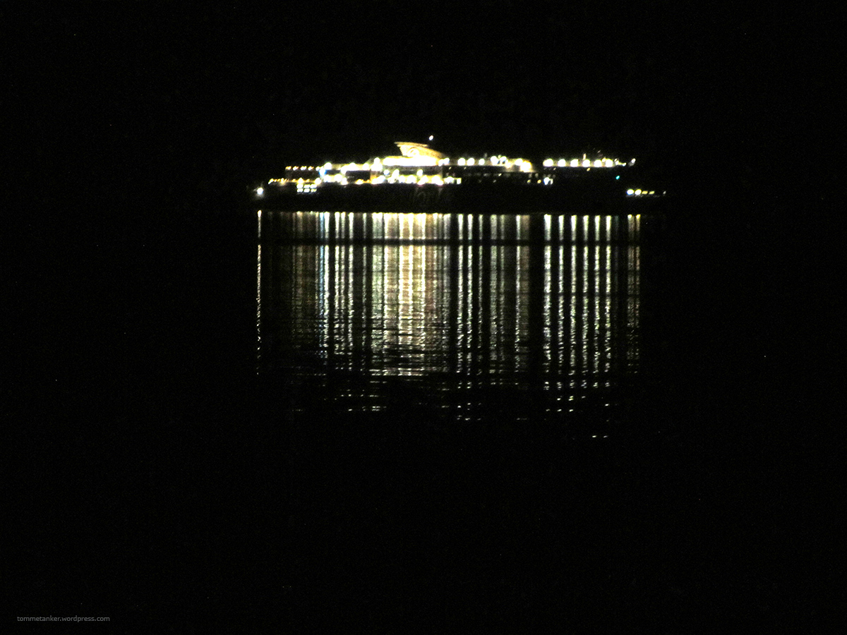Når øynene glipper og hjernen ruller over på ryggen og vil bli klødd på magen, er det på tide å legge seg. Verden går i langsom kino og BigBangTheory er akkurat ferdig på TVn. Jeg husker ikke om jeg så slutten. TV-kvelden avsluttes gjerne med å se på BigBang Theory. Den er ferdig klokka midnatt. Og ett minutt inn i arbeidernes dag,- 1.mai, går jeg sløvt ut foran hytta og pusser tennene. Der står jeg nesten i all salgs vær. Det er befriende deilig å kjenne naturen en siste gang før kosedyna lokker. Og ofte ser jeg Super Speed mens gummene børstes. På stille dager kjennes brumlinga i sjøen og svabergene lenge før den kommer til syne bak Dvergsøya. Den siger langsomt og lysende innover mot sin natts havn. Som tusenvis synkrone ildfluer seiler den ytterst i fjorden. Det er et flott rolig syn før jeg skyller munnen og går inn i hyttas lune varme igjen. God Natt Super Speed og hei 1.mai.