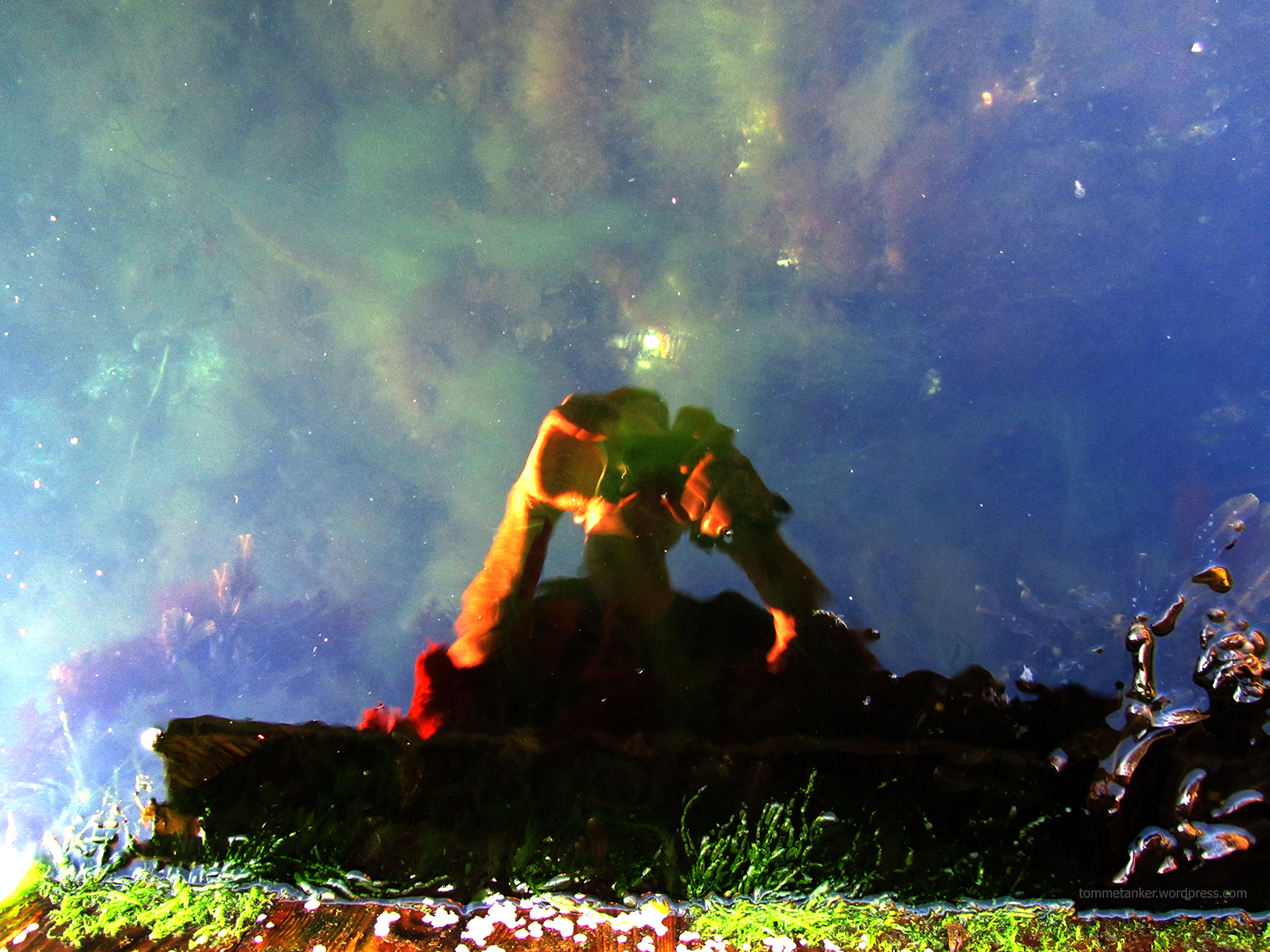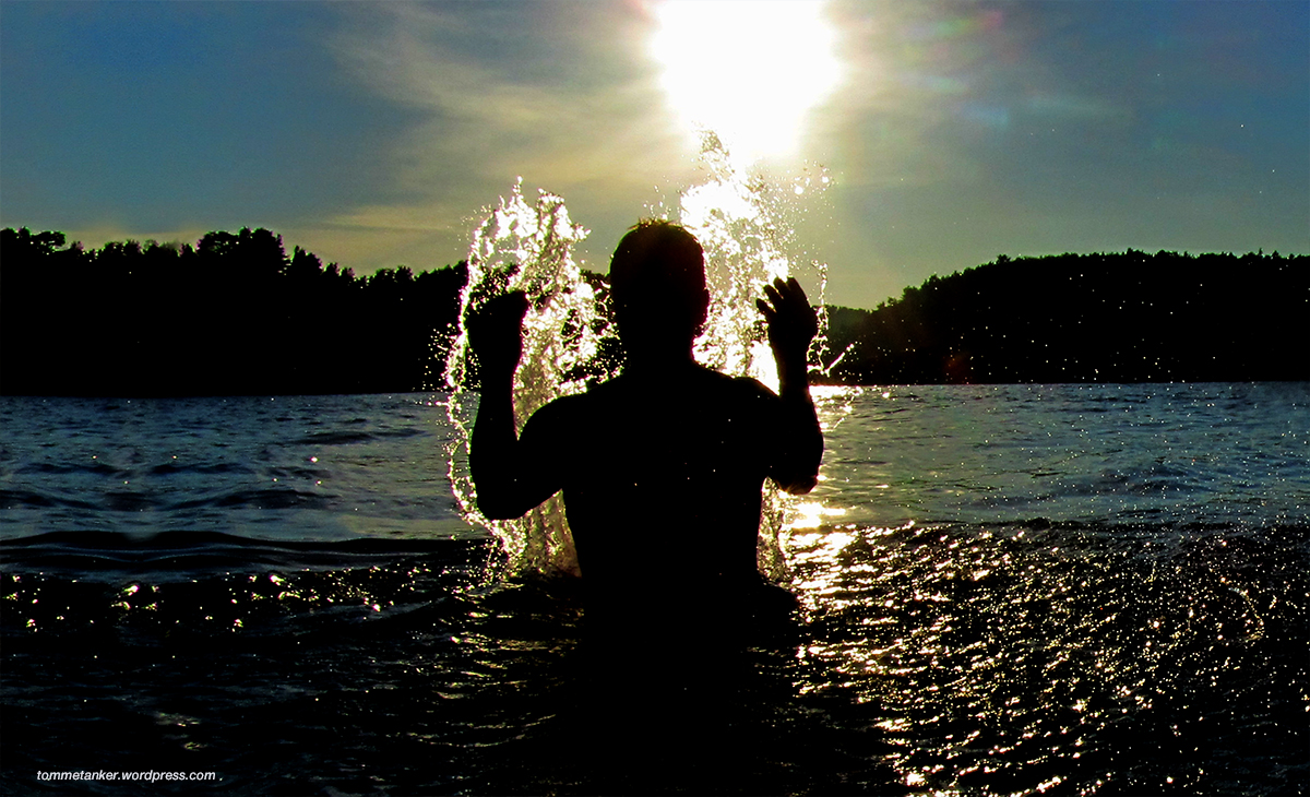 Helt uforberedt ble solens stråler kastet på oss. Først satt vi lett sjelvende bak fortrukne gardiner og skulte ned på gressstrå som stod rett opp! Vi så på måkene som måtte bruke vingene for å fly. Vi tittet på sjøen som var flat og på svabergene som var tørre. Men så gikk det opp for oss. Det var bleiga! Solkremflasker stående passivt ubenytta i krinkler og kroker ble vrengt frem og febrilsk gnikket på overrasket hud. Sol! Stille!