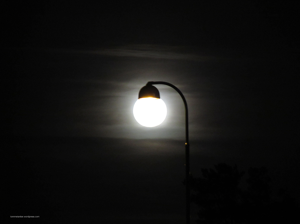 Når fullmåne og gatelys forenes. Jeg liker månen og natten og prøver stadig å ta bilder av månelys. Endelig lykkes jeg. Kanskje mitt beste foto. Mitt vesle Canon kamera så nesten det jeg så. Det var en mørk, fuktig og disig kveld hvor fullmånen sèg opp gjennom slør av skyfiltre. I seg selv vakker og drømmende. Jeg har alltid kamera med meg så jeg gikk opp og ned ei gate på Dvergsnes og tok bilder. Innimellom stod jeg bare i undring og så denne søvnige utgaven av månen. Det var bare flott.